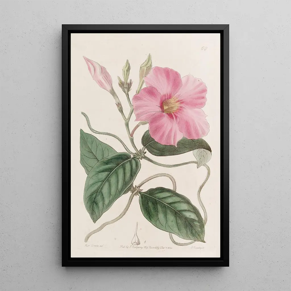 Sydenham Edwardsin "Dipladénia nœdissä" -taidegrafiikka vie meidät eloisaan maailmaan, jossa luonto kukoistaa loistokkaasti. Kukkien hohtavat värit, vaaleanpunaisesta violettiin, sekoittuvat harmonisesti, luoden iloisen ja dynaamisen ilmapiirin. Vesiväritekniikka, jota käytetään hienovaraisesti, mahdollistaa herkkien terälehtien ja lehtien rikkauden vangitsemisen. Jokainen yksityiskohta on huolellisesti toteutettu, kutsuen katsojan lähestymään ihailemaan tämän köynnöskasvin kauneutta. Kompositio, joka on sekä tasapainoinen että rohkea, herättää keveyden ja raikkauden tunteen, kuin keväinen tuulahdus.