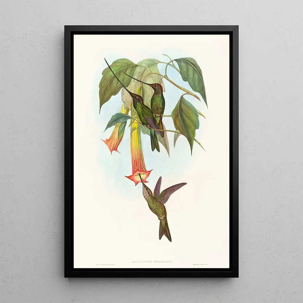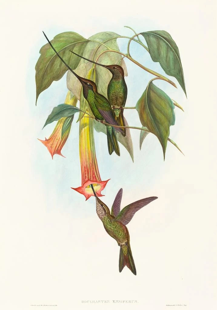 Docimastes ensiferus : upea lintuharrastuksen ihme löydettäväksi La reproduction de Docimastes ensiferus, également connu sous le nom de "faucon à long bec", est une œuvre captivante qui attire l'œil par ses couleurs vives et sa composition dynamique. John Gould, un ornithologue et illustrateur britannique, a su capturer l'essence de cet oiseau rare avec une précision remarquable. Les nuances de bleu et de jaune se mêlent harmonieusement, créant une atmosphère à la fois vivante et sereine. La technique de gravure utilisée par Gould permet de rendre les détails des plumes et des traits du visage de l'oiseau d'une manière presque photographique, invitant le spectateur à plonger dans le monde fascinant de l'ornithologie. John Gould : pionnier de l'ornithologie illustrée John Gould, actif au XIXe siècle, est souvent considéré comme l'un des plus grands ornithologues de son temps. Sa passion pour les oiseaux l'a conduit à voyager à travers le monde, collectant des spécimens et réalisant des illustrations d'une précision inégalée. Influencé par le mouvement naturaliste, Gould a contribué à la documentation de nombreuses espèces, dont certaines n'avaient jamais été décrites auparavant. Son œuvre a non seulement enrichi la science ornithologique, mais a également influencé les artistes et les naturalistes de son époque. La reproduction de Docimastes ensiferus témoigne de son engagement envers la beauté et la diversité de la faune aviaire. Une acquisition décorative aux multiples atouts Cette reproduction du tableau Docimastes ensiferus est un choix idéal pour embellir votre intérieur, que ce soit dans un salon, un bureau ou une chambre. Sa qualité d'impression et sa fidélité aux détails originaux font de cette toile un véritable atout décoratif. L'œuvre de Gould, avec son attrait esthétique indéniable, apporte une touche de nature et d'élégance à votre espace. En intégrant cette pièce dans votre décoration, vous invitez non seulement la beauté de la faune dans votre quotidien, mais vous offrez également un hommage à l'héritage artistique et scientifique de John Gould.
