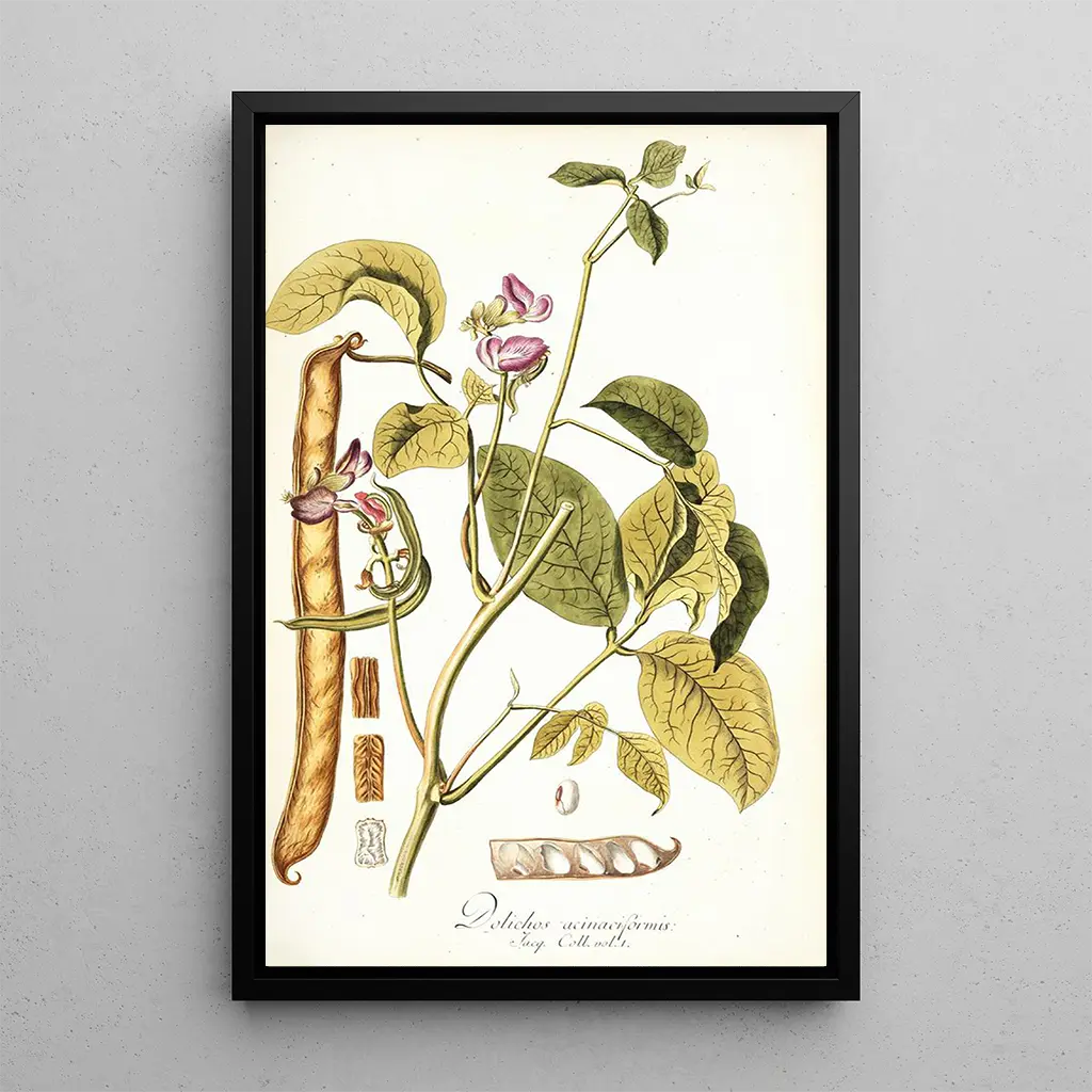 Dolichos acinaciformis -taidegrafiikka, jonka on luonut Nikolaus Joseph Freiherr von Jacquin, erottuu orgaanisilla muodoillaan ja eloisilla väreillään. Herkät kukat ja käpristyneet lehdet on esitetty huolellisesti, mikä korostaa tämän kasvin sisäistä kauneutta. Väriharmonia, joka liikkuu violetin, vihreän ja valkoisen välillä, luo elävän ja dynaamisen ilmapiirin. Tämä taidegrafiikka kutsuu sukeltamaan kasvien maailmaan, jossa jokainen yksityiskohta juhlistaa luonnon monimuotoisuutta.