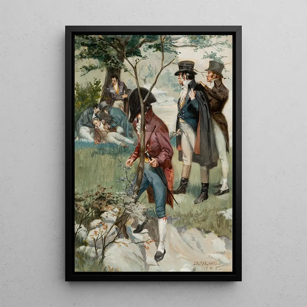 John Norval Marchand, joka toimi 1900-luvun alussa, on tunnettu teoksistaan, jotka tutkivat kilpailun ja konfliktin teemoja. Hänen tyylinsä, joka on saanut vaikutteita impressionistiliikkeestä ja akateemisen maalaustaiteen tekniikoista, erottuu kyvystään vangita liike ja tunne. "Duels" kuvaa täydellisesti hänen kykyään esittää jännitteisiä kohtauksia, samalla heijastaen aikaa, jolloin taistelut nähtiin kunnian kysymyksenä. Marchand on onnistunut vakiinnuttamaan asemansa merkittävänä taiteilijana, tutkien inhimillisten suhteiden monimutkaisuutta taiteensa kautta.