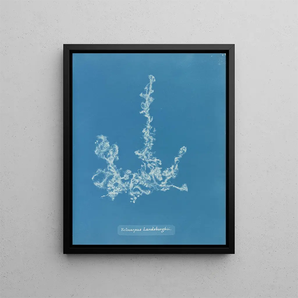 Ectocarpus landsburghii - Anna Atkins taidetuloste erottuu ainutlaatuisella tyylillään, joka yhdistää tieteellisen tarkkuuden ja taiteellisen herkkyyden. Cyanotype, valokuvaustekniikka, joka käyttää auringonvaloa luodakseen syvän sinisiä vaikutelmia, antaa teokselle eteerisen tunnelman. Herkät muodot ja yksityiskohtaiset levien yksityiskohdat korostuvat kontrastissa intensiivisen sinisen ja kirkkaan valkoisen välillä, luoden kiehtovan visuaalisen harmonian. Jokainen kappale on luonnon juhla, kunnianosoitus merenelävien monimuotoisuudelle. Taustan yksinkertaisuus korostaa kuvioiden monimutkaisuutta, kutsuen katsojan syvälliseen pohdintaan. Tämä teos ei ainoastaan esitä levää; se herättää rauhan ja ihmetyksen tunteen, kutsuen sukeltamaan vesimaailmaan.