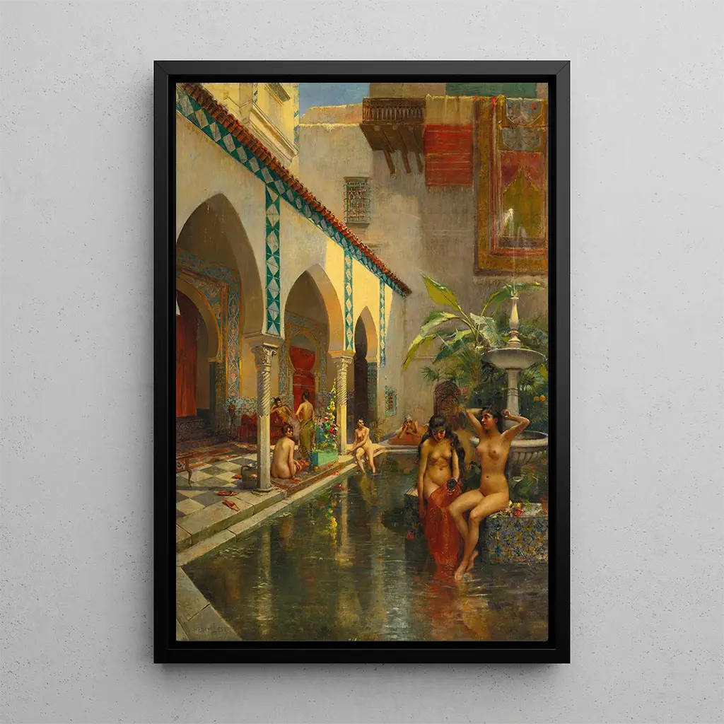 Taidegrafiikka "Ylellinen eksoottinen piha" Henri Victor Lesurilta kuljettaa meidät eloisaan maailmaan, jossa värit ja valo loistavat. Tämä kangas, täynnä yksityiskohtia, kuvaa arkipäivän hetkeä rehevässä ympäristössä, jossa luonto kietoutuu harmonisesti arkkitehtuurin kanssa. Lesur käyttää lämpimiä värejä, jotka viittaavat trooppisen ilmaston lämpöön, ja varjojen ja valon leikit luovat lähes taianomaisen tunnelman. Hahmot, vaikka varautuneita, lisäävät tähän teokseen inhimillisen ulottuvuuden, kutsuen katsojan kuvittelemaan itsensä tähän rauhalliseen pihaan, kaukana modernin maailman melusta.