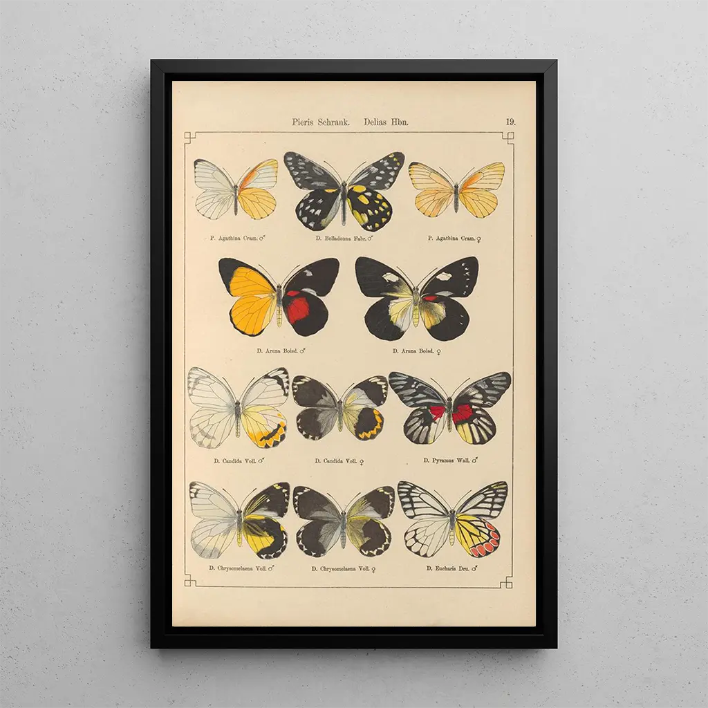 Tässä Papillons exotiques Pl019 -taidegrafiikka-reproduktsioonissa Otto Staudinger kuljettaa meidät eloisaan maailmaan, jossa luonto ilmaisee itseään loistokkaasti. Siipien yksityiskohtaiset, hienovaraiset kuviot paljastavat väriskaalan syvästä sinisestä kirkkaaseen keltaiseen. Vesiväritekniikka, käytettynä hienovaraisesti, luo kevyen ja ilmavan tunnelman, kutsuen katsojan ihmettelemään näiden olentojen ohikiitävää kauneutta. Jokainen perhonen näyttää heräävän eloon, leijuen sulavasti paperilla kuin olisi hetki lähdössä lentoon.