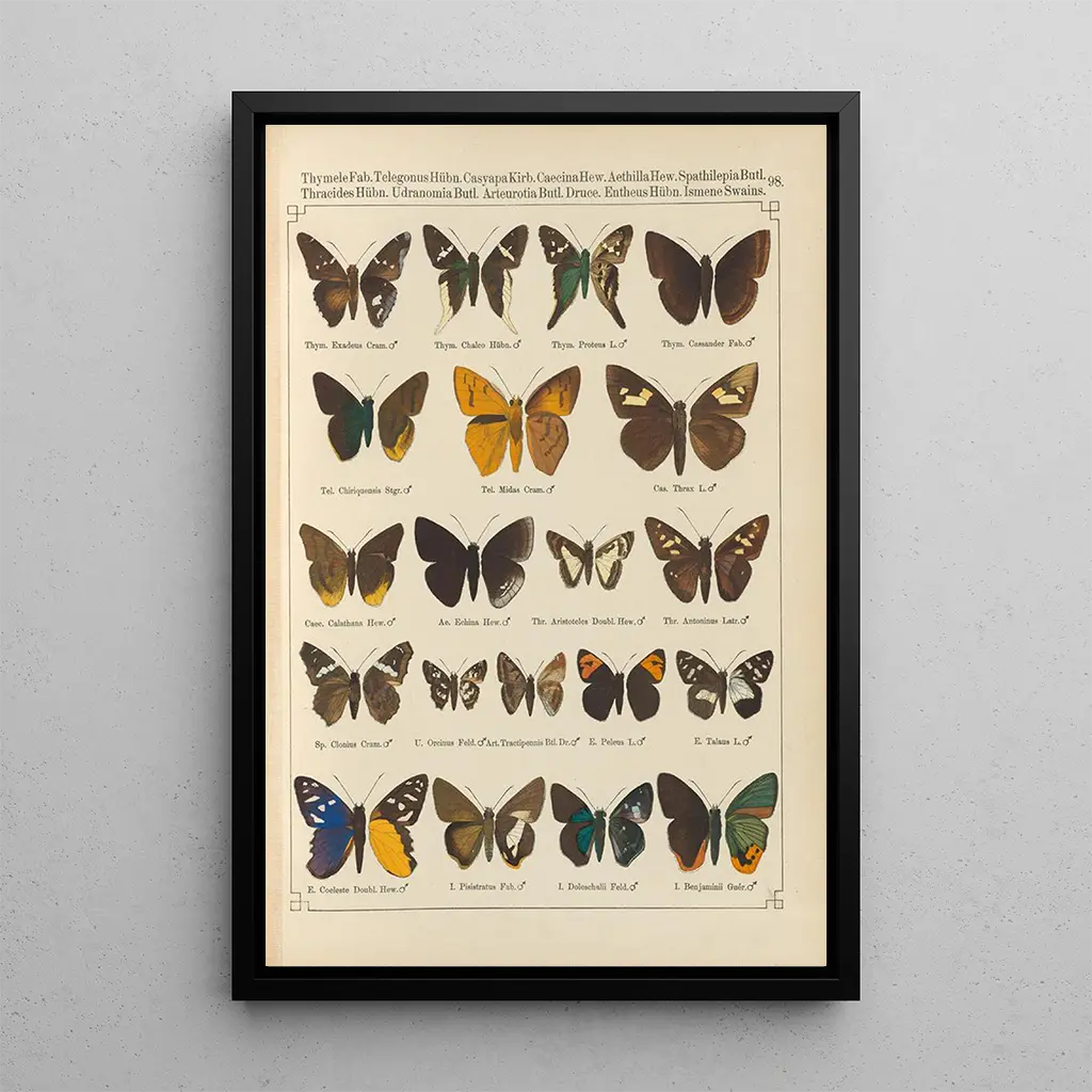 Otto Staudingerin "Papillons exotiques Pl098" -taidegrafiikka vangitsee luonnon kauneuden olemuksen eloisalla väripaletilla ja yksityiskohtaisilla kuvauksilla. Jokainen perhonen on esitetty poikkeuksellisen tarkasti, korostaen niiden siipien kirkkaat sävyt. Sinisen, keltaisen ja punaisen sävyt sekoittuvat harmonisesti, luoden sekä iloisen että rauhoittavan tunnelman. Vesiväritekniikka, käytetty hienovaraisesti, lisää teokseen keveyttä kuin perhoset heräisivät eloon kankaalle. Tämä taidegrafiikka kutsuu hiljaiseen pohdintaan, jossa voi melkein kuulla siipien lempeän lyönnin.