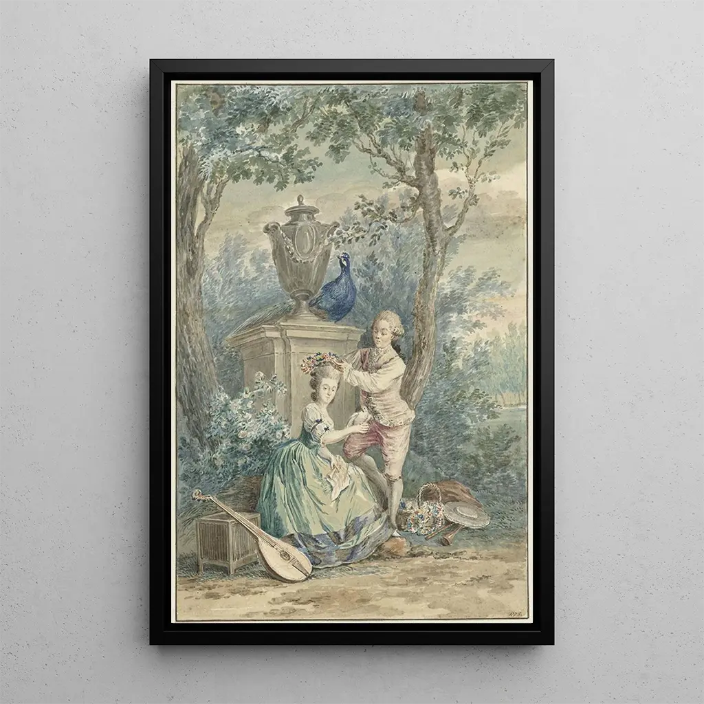 Tässä taidegrafiikan uudelleenluonnoksessa "Pariskunta tyylikkäästi puistossa" Nicolaes Muys vangitsee hetken rauhaa ja eleganssia. Hahmot, pukeutuneina hienostuneisiin pukuisiin, seisovat rehevässä puistossa, ympäröitynä vehreydellä ja loistavilla kukilla. Pastellivärit, pehmeät ja valoisat, luovat romanttisen tunnelman, kun taas Muysin tekniikka, hienovaraisin siveltimenvedoin, herättää eloon jokaisen yksityiskohdan. Teos kutsuu rauhoittavaan pohdintaan, jossa melkein voi kuulla tuulen huminan puissa ja lintujen laulun.