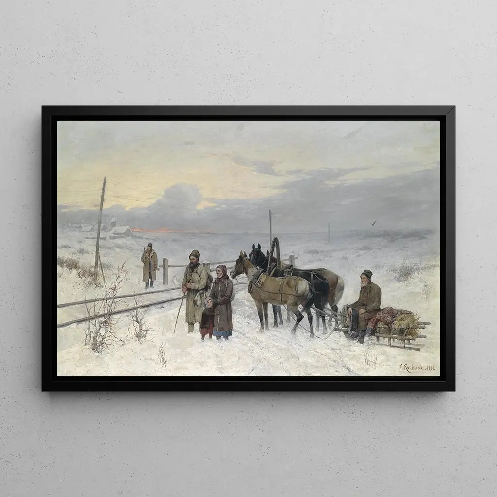 La reproduction d'En attendant le train de Franz Roubaud capture un moment de calme suspendu, où les personnages semblent figés dans l'attente. La scène, riche en détails, évoque une atmosphère nostalgique, où le train, symbole de voyage et d'évasion, se fait désirer. Les couleurs chaudes et terreuses, mêlées à des touches de lumière, créent une ambiance à la fois intime et dynamique. Roubaud excelle dans la représentation des émotions humaines, et cette œuvre ne fait pas exception, invitant le spectateur à ressentir l'impatience et l'espoir des voyageurs.