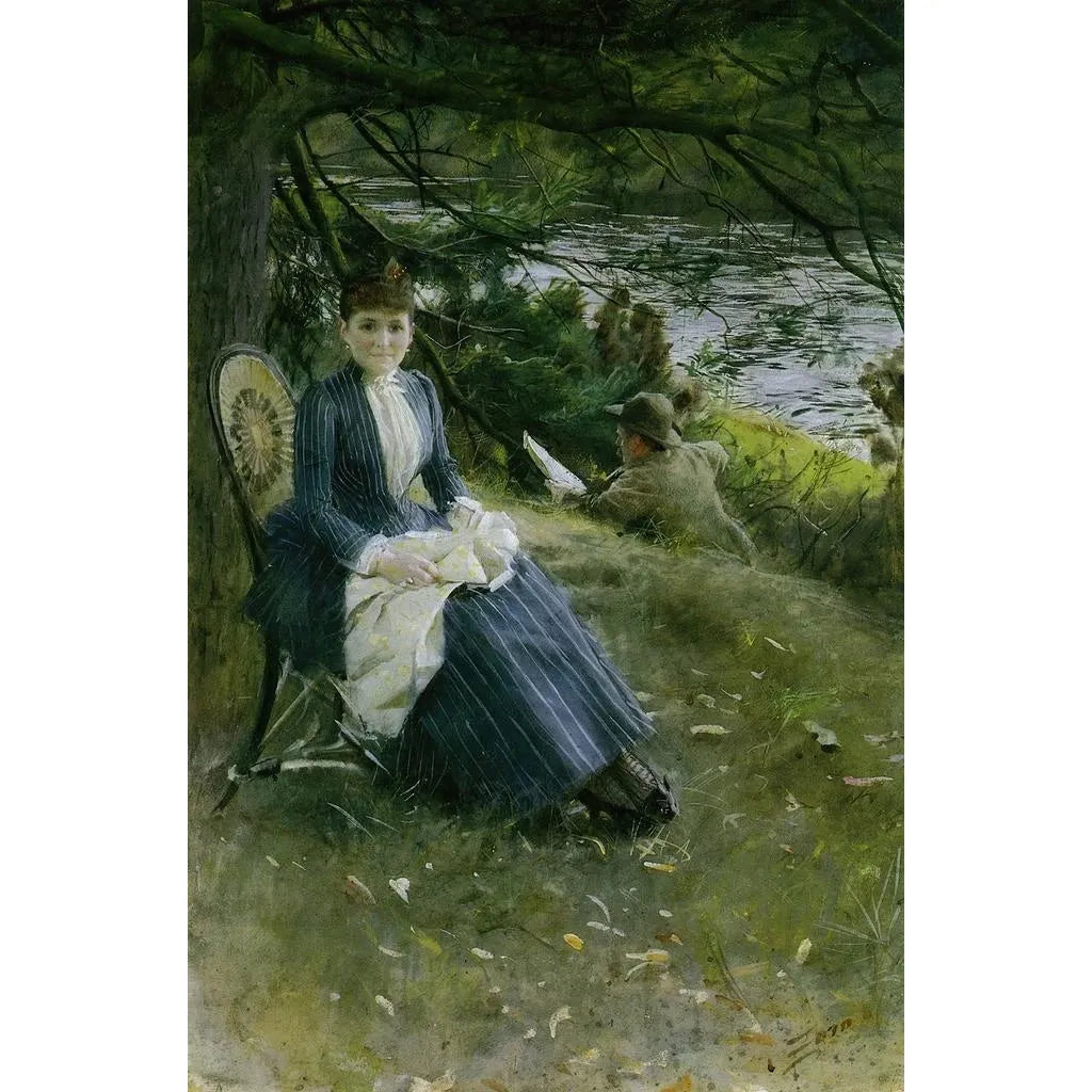 Taidegrafiikka teoksesta En Écosse Madame Symons, jonka on luonut Anders Zorn, kuljettaa meidät lumoavaan skotlantilaiseen maisemaan, jossa luonto ja ihmisyys kohtaavat harmonisesti. Maalaus esittää eleganttia naista, joka on pukeutunut perinteiseen pukuun, ja hän seisoo maalauksellisessa ympäristössä. Kirkkaat värit ja vihreän sävyt heijastavat skotlantilaisten maisemien raikkautta, kun taas Zornin tekniikka, joka on luonteeltaan sulava ja dynaaminen sivellinvetoineen, luo elävän ja energisen tunnelman kohtaukseen. Tämä teos kutsuu mietiskelyyn ja pakoon arjesta, paljastaen yksinkertaisten hetkien kauneuden.