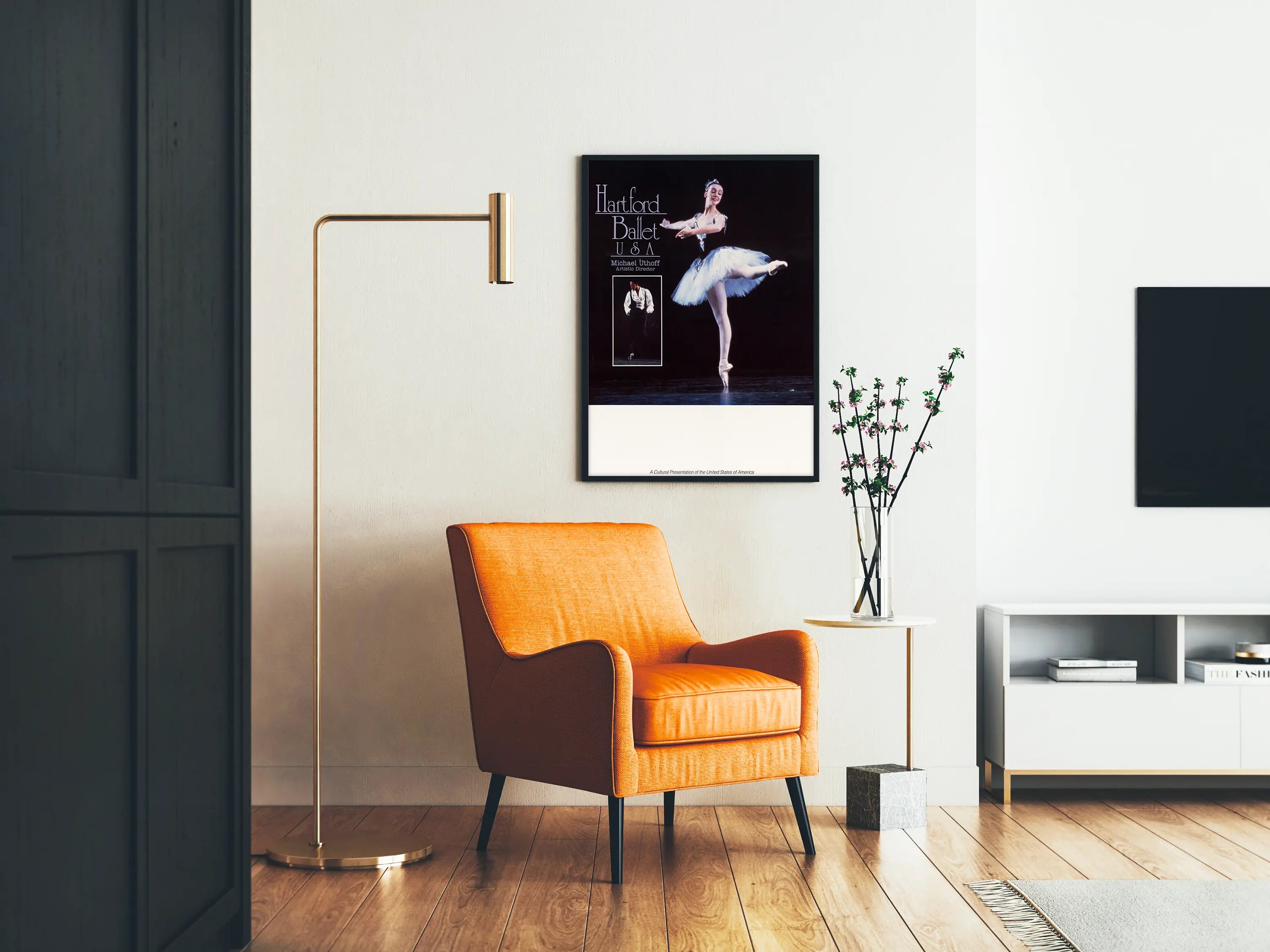 Tämä seinäkoristejuliste korostaa klassisen baletin eleganssia ja tarkkuutta kuvaamalla valkoisessa tutussa tanssijaa, joka on tallennettu täydessä suorituksessa lavalla. Julisteessa on myös pienempi kuva perinteisessä puvussa olevasta tanssijasta, mikä luo mielenkiintoisen visuaalisen kontrastin ja syvyyttä kokonaisuuteen. Täydellisesti taiteen ja tanssin ystäville sopiva seinätaulu juhlistaa Hartford Ballet USA:ta, erityismaininnan antaen taiteelliselle johtajalle Michael Uthoffille, mikä lisää teokseen ammatillista ja kulttuurista ulottuvuutta. Julisteen syvä musta tausta korostaa tanssijan valoa, korostaen liikkeiden hienostuneisuutta ja puvun kauneutta. Se on hienostunut seinäkoriste, joka sopii täydellisesti olohuoneeseen, teatteriin tai taiteeseen omistettuun tilaan, tuoden ripauksen eleganssia ja hienostuneisuutta. Sisustussuunnittelun näkökulmasta tämä juliste on ihanteellinen niille, jotka haluavat tuoda ympäristöönsä taiteellista tunnelmaa, joka ammentaa amerikkalaisesta klassisesta baletista. Hillitty ja tyylikäs teksti sekä ilmava asettelu luovat visuaalisen harmonian, joka korostaa sekä aihetta että taustaa. Tämän tyyppinen juliste voi myös inspiroida tanssijoita, opiskelijoita tai harrastajia, jotka haluavat koristaa tilansa teoksella, joka herättää tanssin kauneuden ja tunteen lavalla. Yhteenvetona tämä seinäkoriste on visuaalinen kunnianosoitus baletin taiteelle, täydellinen rikastuttamaan tilaa ainutlaatuisella kulttuurillisella ja esteettisellä kosketuksella.
