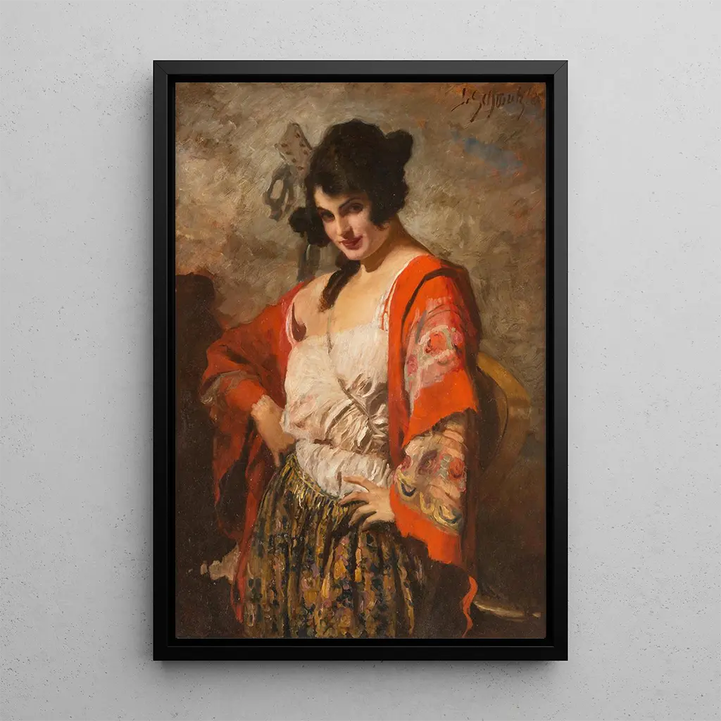 Tässä taidegrafiikassa "Espanjalainen kauneus kitaran kanssa" Leopold Schmutzler vangitsee elävän olemuksen espanjalaisesta kulttuurista herkästi kuvattuna naisfiguurina. Kompositio korostaa kaunista naispuolista hahmoa, joka pitää kitaraa, symbolina intohimosta ja musiikista. Räikeät värit, syvät punaiset ja kirkkaat siniset, herättävät espanjalaisen auringon lämpöä. Schmutzlerin tekniikka, joka yhdistää realismia ja impressionistisia sävyjä, herättää eloon perinteisten vaatteiden tekstuurin ja korujen loiston, luoden juhlavan ja iloisen tunnelman. Tämä teos kutsuu juhlimaan espanjalaisen kulttuurin kauneutta ja rikkautta.