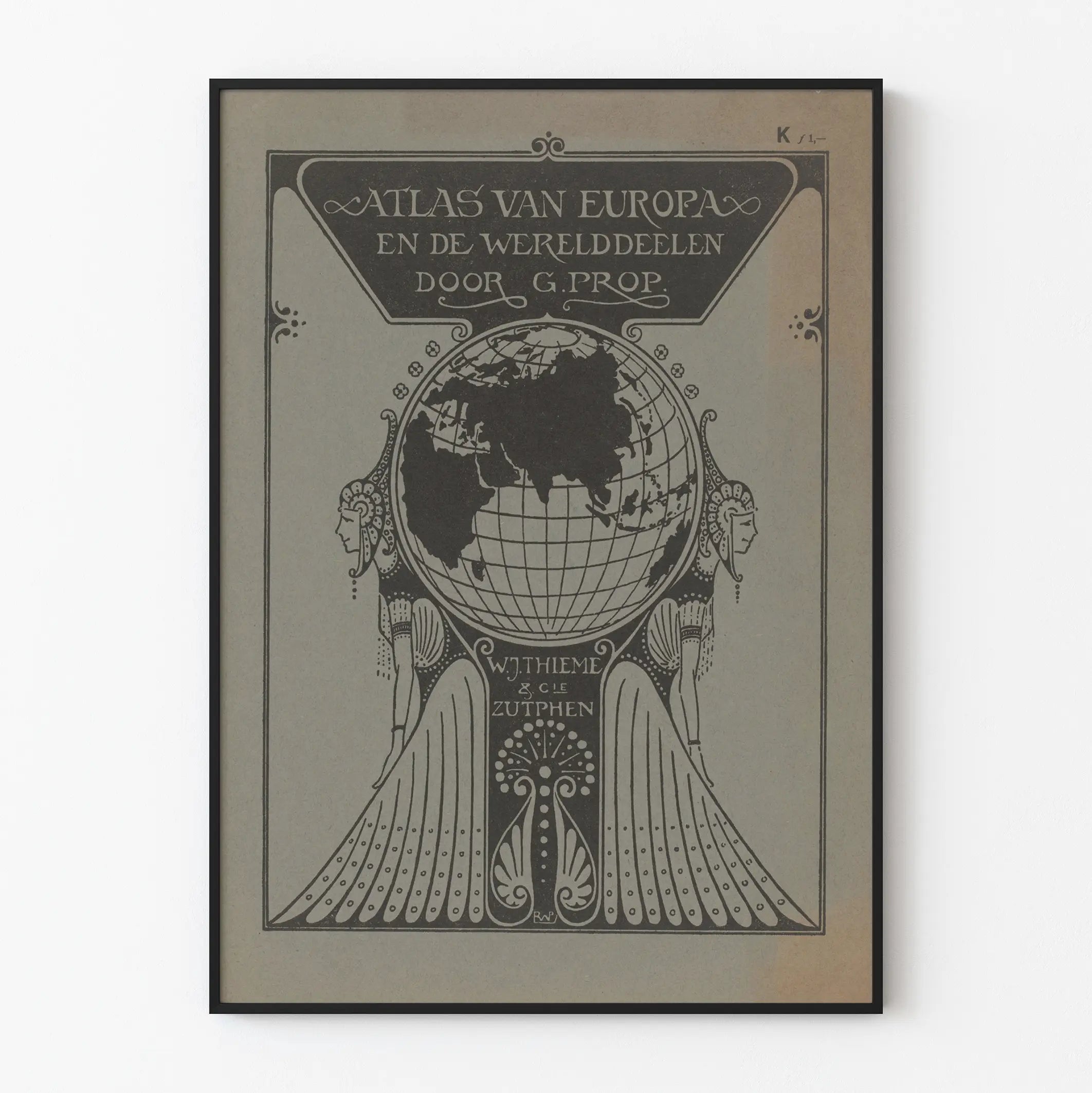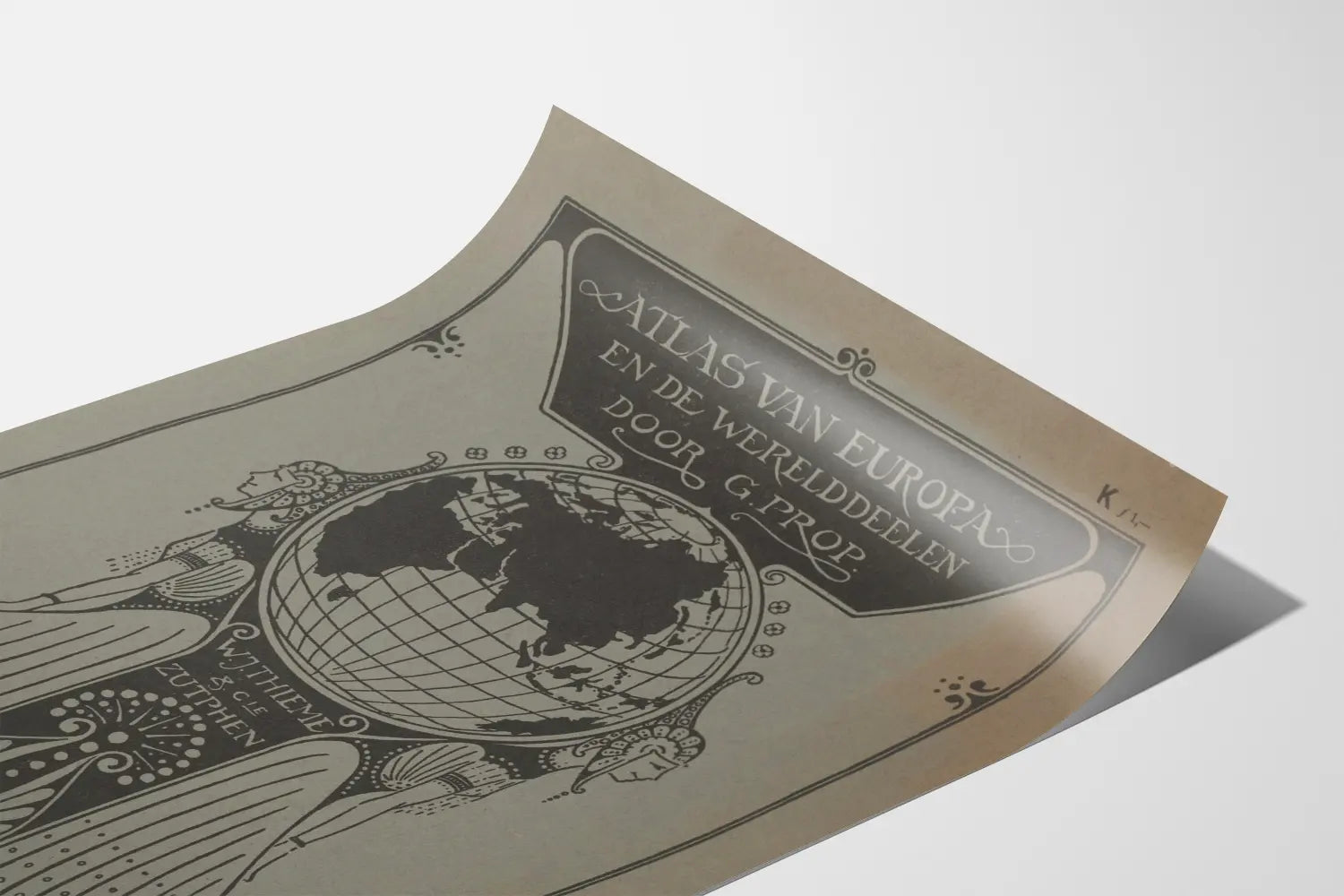 Tämä vintage- juliste esittää Euroopan ja mantereiden atlasin kantta, G. Propin teos, julkaissut W.J. Thieme & Cie Zutphenissä. Se on ainutlaatuinen seinäkoriste, joka sopii erinomaisesti kartografiasta ja historiasta kiinnostuneille. Muotoilu korostaa tyyliteltyä mustavalkoista maailmankarttaa harmaalla taustalla, ja sen kehystävät kaksi art deco -tyylistä naishahmoa, jotka todennäköisesti symboloivat vakautta ja viisautta, tuoden tähän julisteeseen taiteellista ja eleganttia vivahdetta. Alankielinen teksti selkeästi ilmoittaa atlasin nimen, vahvistaen sen aitouden ja ikääntymisen vaikutelman. Tämä vintage-juliste voidaan käyttää sisustustulosteena toimistossa, olohuoneessa tai kirjastossa, luoden sekä kulttuurisen että hienostuneen tunnelman. Sen typografia ja graafiset koristeet korostavat sen taiteellista ja vanhaa luonnetta, sulautuen täydellisesti klassisen tai retro-tyylisen sisustuksen maailmaan. Maantieteellisen esityksensä ansiosta se viittaa myös matkaan eri mantereilla, herättäen uteliaisuutta ja ihailua maailmasta historiallisesta näkökulmasta. Etsitpä sitten seinäkoristetta eurooppalaiseen tilaan tai teemalliseen sisustukseen, joka liittyy maantieteeseen ja matkailuun, G. Propin atlas-juliste on erottuva valinta. Se on suunnattu graafisen taiteen harrastajille ja aikakauden karttaesineiden keräilijöille. Graafisen laadun ja visuaalisen koostumuksensa ansiosta tämä juliste on helposti saavutettava ja ainutlaatuinen seinäkoriste, joka voi korostaa mitä tahansa seinää kulttuurillisella ja esteettisellä arvolla. Yhteenvetona tämä Euroopan ja mantereiden atlas-juliste edustaa täydellistä yhdistelmää graafisesta taiteesta, kartografiasta ja seinäkoristeesta. Se yhdistää eleganssin, historian ja nykyaikaisuuden yksinkertaisessa ja ajattomassa tyylissä.