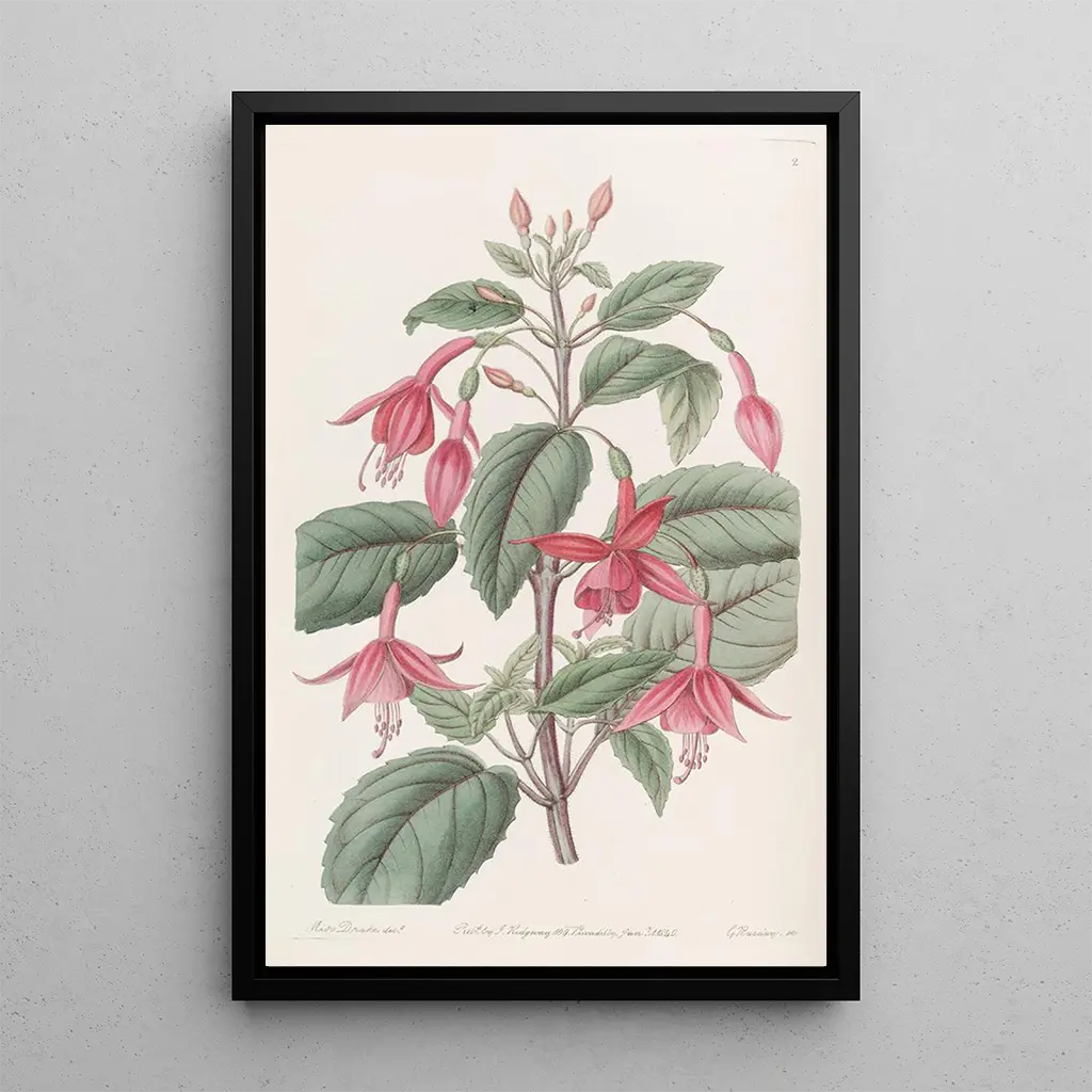 La taidegrafiikka de Fuchsia de Standish, jonka on toteuttanut Sydenham Edwards, on todellinen ylistys luonnon kauneudelle. Tämä kangas erottuu eloisilla sävyillään, kuten roosa, violetti ja vihreä, jotka kietoutuvat yhteen luoden harmonisen ja dynaamisen koostumuksen. Herkät fuksia-kukat, joiden terälehdet roikkuvat, näyttävät melkein tanssivan kevyen tuulenpuuskan alla. Edwardsin käyttämä vesiväritekniikka antaa teokselle keveyttä ja läpinäkyvyyttä, mikä mahdollistaa värien hienovaraisen päällekkäisyyden. Tämän teoksen tunnelma on sekä iloinen että rauhoittava, kutsuen katsojan sukeltamaan rehevään puutarhaan.