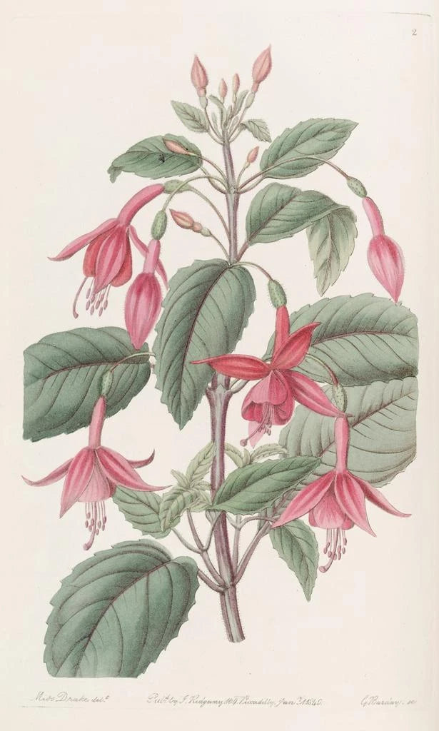 Sydenham Edwards, joka oli aktiivinen 1800-luvun alussa, tunnetaan yhtenä aikansa ensimmäisistä kasvitieteellisistä kuvittajista. Hän kouluttautui Royal Academyn oppiin ja osasi vangita kasvien kauneuden poikkeuksellisen tarkasti. Hänen teoksensa, kuten Fuchsia de Standish, todistavat hänen sitoutumisestaan tiedettä ja taidetta kohtaan, yhdistäen nämä kaksi alaa opetukseen ja ihastuttamiseen. Edwardsin vaikutteita olivat hänen aikansa kasvitieteelliset löydöt, erityisesti uusien kasvilajien tutkimukset. Hänen työnsä oli ratkaisevan tärkeää eksoottisten kasvien dokumentoinnissa, mikä edisti hortikulttuurin ja kukkasuunnittelun kehittymistä Euroopassa.