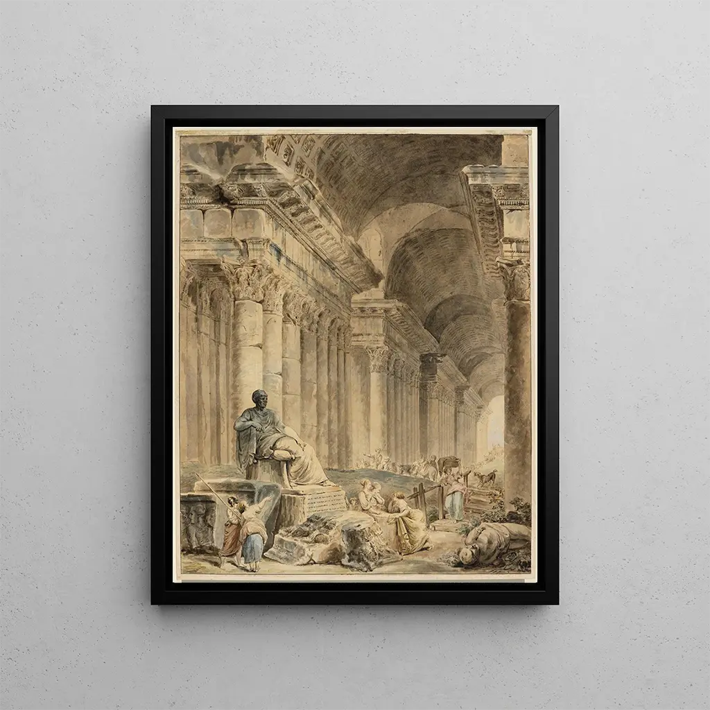 Kolonninen kaarivälise gallery, jossa istuu antiikin patsas - Hubert Robert