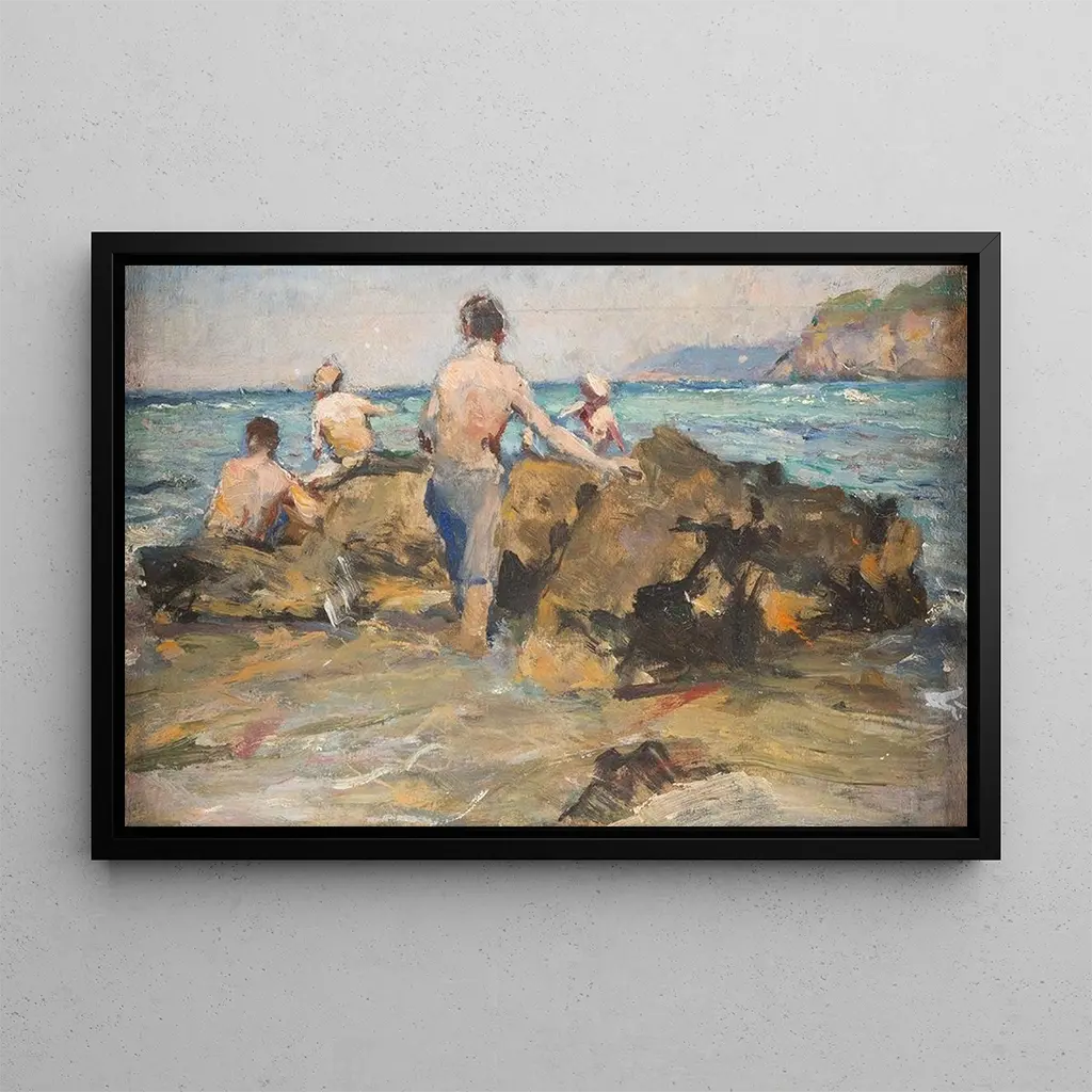Dans cette reproduction de Garçons sur une plage rocheuse, l’artiste Alphons Hollaender capture l’essence d’un moment de joie et de liberté. Les jeunes garçons, plongés dans leurs jeux, sont entourés par des rochers qui se dressent majestueusement. Les couleurs vives et lumineuses évoquent la chaleur du soleil et la fraîcheur de la mer. La technique de l’huile sur toile permet de rendre les détails des visages et des mouvements avec une grande précision, créant ainsi une atmosphère vivante et dynamique. Chaque coup de pinceau semble insuffler une vie nouvelle à cette scène, invitant le spectateur à partager ce moment de bonheur insouciant.
