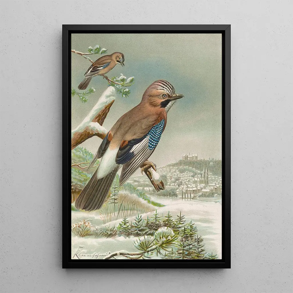 The taidegrafiikka Garrulus glandarius, teos Johann Friedrich Naumannilta, paljastaa kirkkaiden höyhenien omaavan linnun, joka vangitsee eurooppalaisen eläimistön olemuksen. Voimakkaiden sinisten ja ruskeiden sävyjen ansiosta tämä taulu herättää luonnon villin kauneuden ja harmonian. Naumannin hallitsema akvarellitekniikka mahdollistaa höyhenten keveyden ja yksityiskohtien hienostuneisuuden kuvaamisen. Tämän teoksen tunnelma kutsuu ihmetykseen, kuljettaen katsojan maailmaan, jossa luonto paljastuu koko loistossaan.