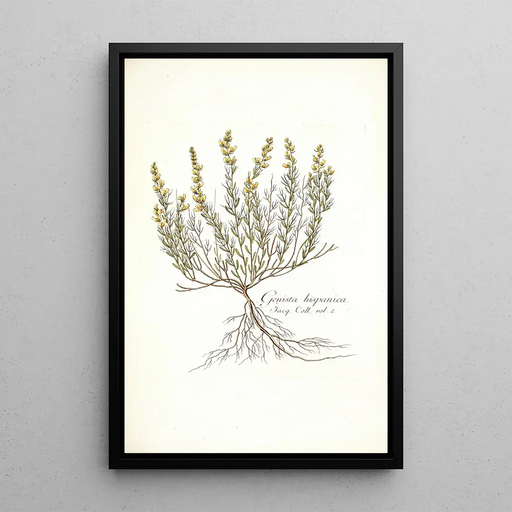 La taidegrafiikka de Genista hispanica sukelsa meidät eloisaan maailmaan täynnä värejä ja hienostuneisuutta. Tämä teos, jonka on luonut Nikolaus Joseph Freiherr von Jacquin, korostaa loistavia kukkia, joiden keltaiset ja vihreät sävyt näyttävät tanssivan valon alla. Vesiväritekniikka, jota on käytetty hienovaraisesti, lisää keveyttä ja läpinäkyvyyttä koostumukseen, tehden jokaisesta terälehdestä lähes tuntuvan. Yleinen tunnelma muistuttaa lempeästä kävelystä luonnossa, jossa jokainen kukkainen yksityiskohta on huolellisesti tarkkailtu ja ikuistettu.