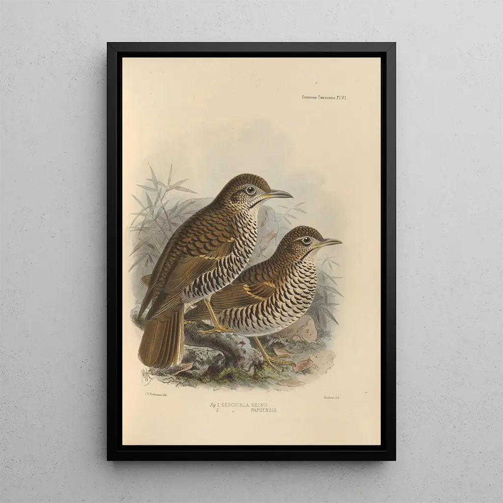 Geocichla Heinii Geocichla Papuensis -taidegrafiikka on erinomainen valinta sisustuksen rikastuttamiseen. Olipa kyseessä olohuone, toimisto tai makuuhuone, tämä kangas tuo raikkautta ja elinvoimaa tilaan. Tulostuslaatu takaa kirkkaita värejä ja yksityiskohtien tarkkuutta alkuperäisteoksesta, samalla tarjoten visuaalisen vetovoiman. Valitsemalla tämän teoksen lisäät sisustukseesi paitsi taideteoksen, myös inspiroivan ja vieraanvaraisen ympäristön vieraillesi.