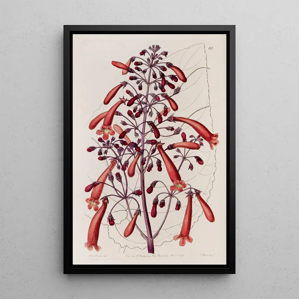 Gesnera vernen taidegrafiikka, jonka on toteuttanut Sydenham Edwards, johdattaa meidät kiehtovaan kasvitieteelliseen maailmaan. Tämä teos, joka huokuu hienostuneisuutta, korostaa lehtien ja kukkien yksityiskohtia, paljastaen eloisan väriskaalan, joka ulottuu syvän vihreästä kirkkaan pinkkiin. Vesiväritekniikka, jota on käytetty mestarillisesti, antaa tälle kankaalle elävän ja lähes kosketeltavan tunnelman. Jokainen terälehti näyttää värähtelevän valossa, kutsuen katsojan tarkkailevaan ja kunnioittavaan luonnonkauneuden ihailuun.