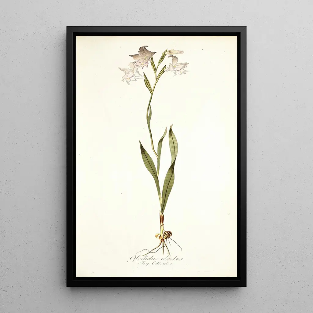 Gladiolus albidus-taidegrafiikka, jonka on luonut Nikolaus Joseph Freiherr von Jacquin, johdattaa meidät herkkään kasvitieteelliseen maailmaan. Teos korostaa majesteettista kukkaa, jonka valkoiset ja kevyesti vihertävät terälehdet heijastavat puhtautta ja luonnollista eleganssia. Vesiväritekniikka, käytettynä hienovaraisesti, mahdollistaa valon ja varjojen vangitsemisen, luoden teokseen rauhallisen ja elävän tunnelman. Jokainen yksityiskohta, lehtien suonista hienovarisiin sävyihin kukissa, kertoo tarkkaavaisuudesta luontoa kohtaan ja kutsuu katsojan rauhoittavaan pohdintaan.