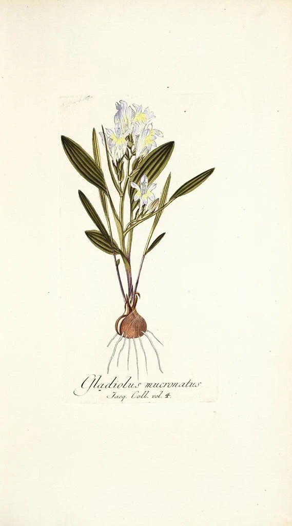 Nikolaus Joseph Freiherr von Jacquin, 1700-luvun botaniikan ja taiteen asiantuntija, oli keskeisessä roolissa botaanisen taidegrafiikan kehityksessä. Väljässä Wienissä hän sai oppia aikansa tieteellisistä löydöksistä ja tutkimusmatkoistaan, jotka rikastuttivat tietämystä maailman kasvistosta. Hänen teoksensa, kuten Gladiolus mucronatus, todistavat ainutlaatuisesta yhdistelmästä tiedettä ja taidetta, jossa jokainen yksityiskohta on huolellisesti havaittu ja esitetty. Jacquin osallistui kasvien luokitteluun ja jätti pysyvän perinnön botaanisen taidegrafiikan alalle, merkiten aikaa, jolloin taide palveli myös opetustarkoituksia.