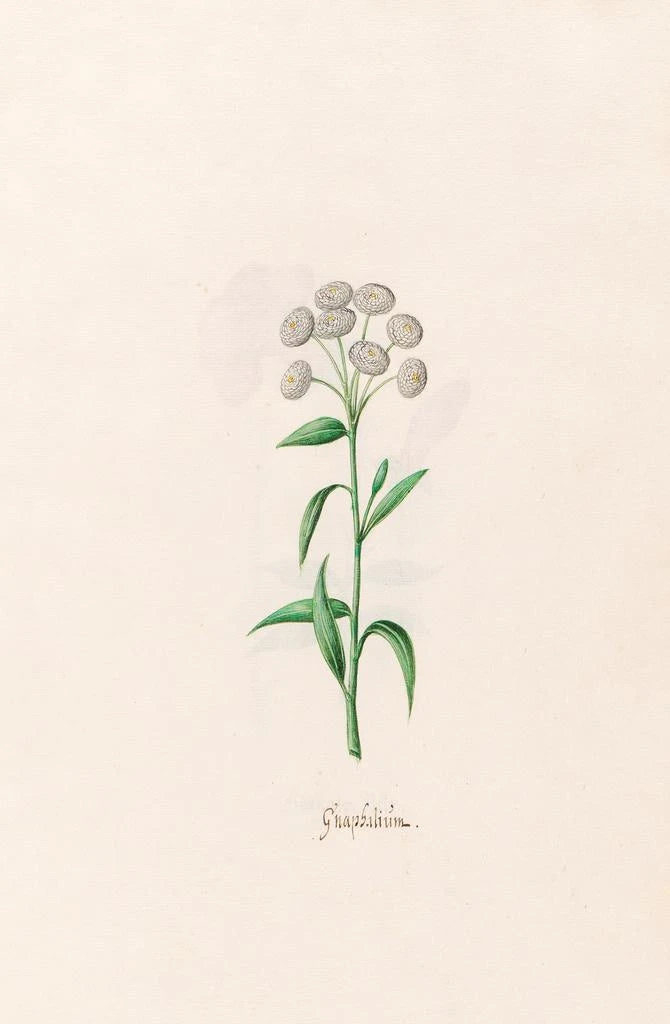 Magdalena Rosina Funckin Gnaphale-taidegrafiikka on kunnianosoitus kasvistolle, jossa jokainen yksityiskohta on huolellisesti sovitettu luomaan harmoninen kokonaisuus. Hienovaraiset vihreän ja sinisen sävyt sekoittuvat kirkkaisiin väreihin, viitaten rehevään ja elävään maisemaan. Öljyvärimaalauksen tekniikka mahdollistaa Funckin vangitsevan lehtien tekstuurin ja terälehtien keveyden, luoden syvyyden ja liikkeen vaikutelman. Tämä teos kutsuu sukeltamaan luonnon maailmaan, jossa kasvien kauneutta korostetaan runollisella herkkyydellä.