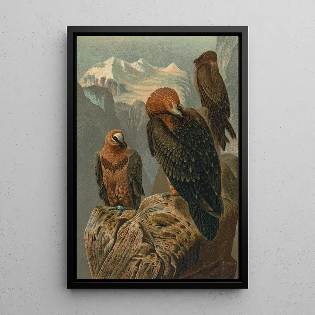 John George Woodin taidegrafiikka Gypaète barbu vie meidät vuoristojen korkeuksiin, missä tämä majesteettinen lintu liitää sulavasti. Sen höyhenpeitteen lämpimät sävyt, jotka yhdistävät ruskean ja oranssin vivahteita, erottuvat sinisen taivaan taustalla. Woodin tekniikka, joka yhdistää realismia ja runoutta, vangitsee paitsi tämän linnun ulkonäön myös sen vaikuttavan luonteen ja majesteetin. Jokainen höyhen tuntuu värähtelevän valon alla, luoden dynaamisen ilmapiirin, joka herättää vapauden ja luonnon voiman tunteen.