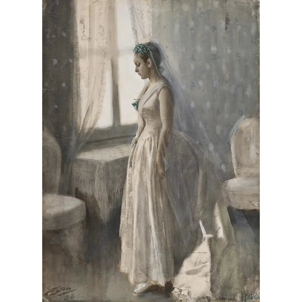 Anders Zorn, né en 1860, est un artiste suédois dont le travail a marqué la fin du XIXe siècle et le début du XXe siècle. Son style, influencé par l'impressionnisme, se caractérise par une maîtrise exceptionnelle de la lumière et des ombres. Zorn a su s'imposer sur la scène artistique internationale, réalisant des portraits de personnalités éminentes et explorant des thèmes liés à la culture suédoise. « La mariée » est l'une de ses œuvres emblématiques, témoignant de son habileté à capturer la beauté féminine et les émotions humaines.