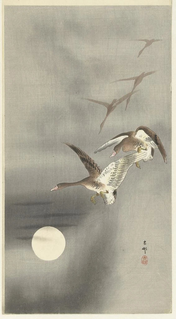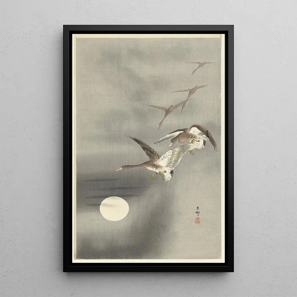 Oies en vol : upea taiteellinen tanssi täynnä eleganssia L'œuvre "Oies en vol" d'Ohara Koson capture un moment fugace dans la nature, où des oies majestueuses s'élèvent dans le ciel. Les nuances délicates de bleu et de blanc se mêlent harmonieusement, créant une atmosphère sereine et poétique. La technique de l'estampe sur papier, typique de l'ukiyo-e, permet de rendre la légèreté des oiseaux en plein vol, tandis que les détails minutieux des plumes ajoutent une touche de réalisme. Cette reproduction évoque une sensation de liberté et de paix, invitant le spectateur à s'évader dans un monde naturel enchanteur. Ohara Koson : un maître de l'estampe japonaise Ohara Koson, actif au début du XXe siècle, est reconnu pour ses œuvres emblématiques qui célèbrent la beauté de la nature et des animaux. Influencé par les traditions de l'estampe japonaise, il a su allier modernité et techniques ancestrales, se démarquant par son style unique. Koson a souvent représenté des oiseaux, des fleurs et des paysages, témoignant d'une profonde admiration pour son environnement. Son travail a eu un impact significatif sur l'art japonais et a contribué à la diffusion de l'esthétique nipponne à l'échelle internationale, faisant de lui une figure incontournable de son époque. Une acquisition décorative aux multiples atouts La taidegrafiikka "Oies en vol" est une pièce décorative idéale pour apporter une touche d'élégance à votre intérieur. Que ce soit dans un salon, un bureau ou une chambre, ce tableau saura séduire par sa beauté et sa finesse. La qualité d'impression garantit une fidélité remarquable aux détails de l'œuvre originale, tandis que son attrait esthétique en fait un élément de conversation captivant. En intégrant cette toile dans votre décoration, vous invitez une part de la culture japonaise chez vous, tout en créant une atmosphère apaisante et inspirante.