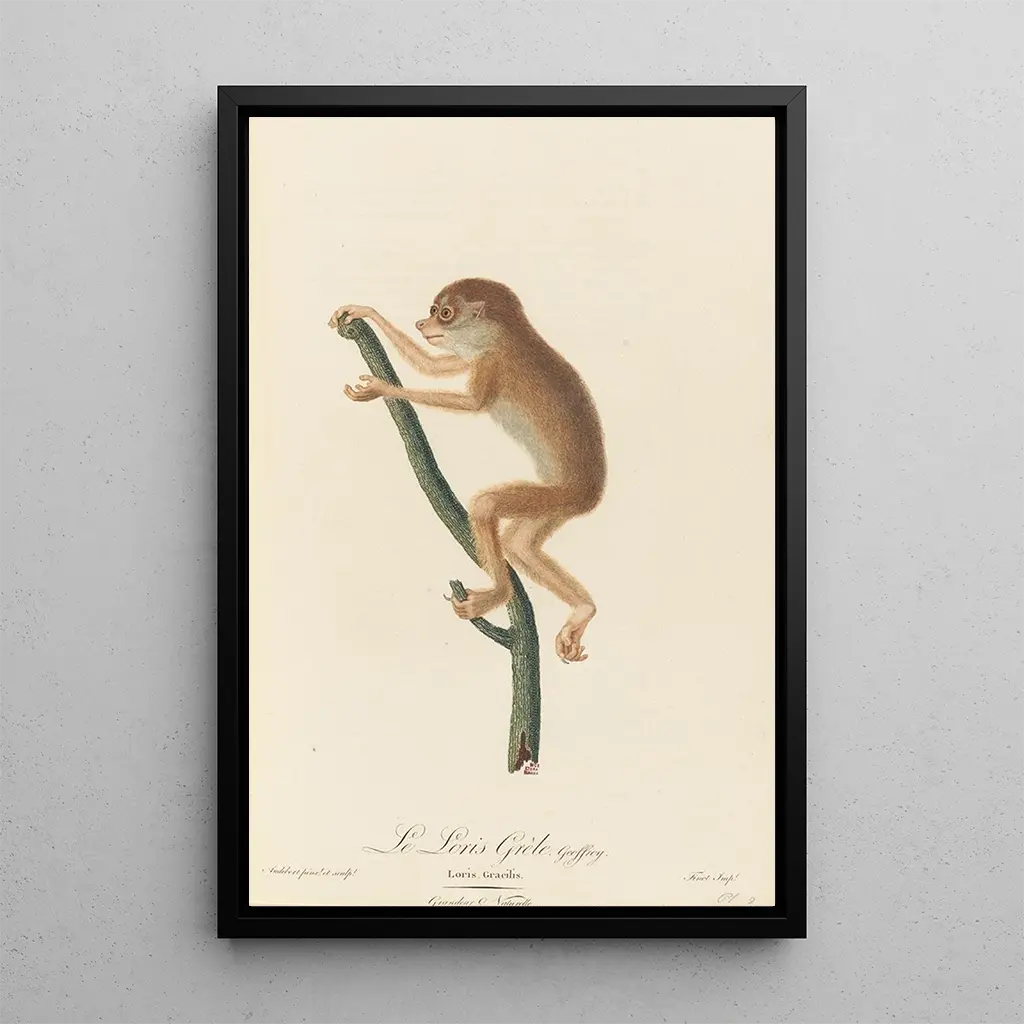 Le Loris gris, Jean-Baptiste Audebertin merkittävä taidegrafiikka, vangitsee luonnon elämän ytimen poikkeuksellisella hienostuneisuudella. Tämä yksityiskohtiin rikas taulu esittää silkkistä turkkia omaavaa primateja, joka on varovasti asetettu oksalle. Pehmeät ja luonnolliset värit, rauhoittavista vihreistä lämpimiin ruskeisiin, luovat rauhallisen ja pohdiskelevan ilmapiirin. Aquarellitekniikka, jonka Audebert hallitsee, mahdollistaa turkin tekstuurin ja lehtien kirkkauden tarkan esittämisen. Tämä taidegrafiikka kutsuu katsojan sukeltamaan kiehtovaan lorisien maailmaan, samalla juhlistaen luonnon kauneutta.