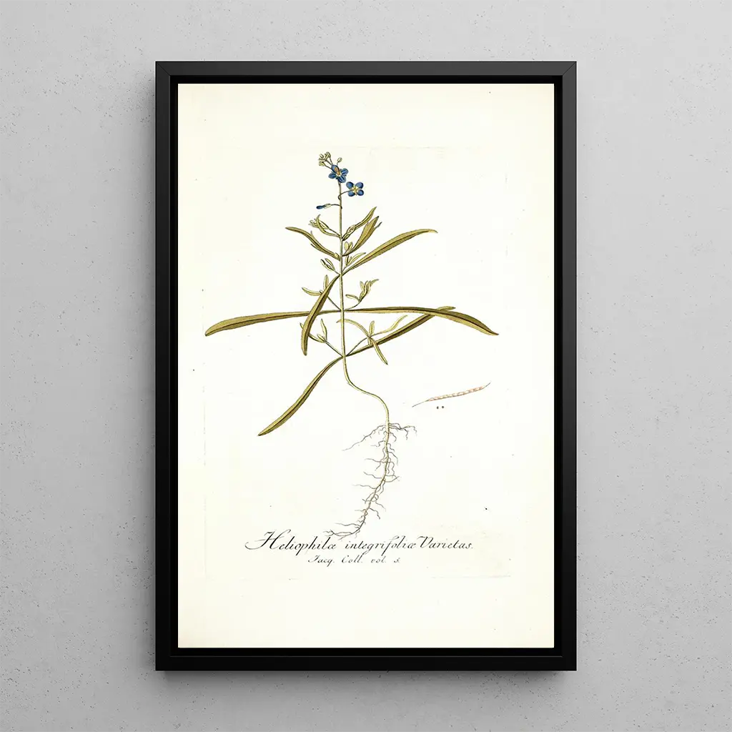 Taidemääritys Heliophila integrifolia vie meidät eloisaan maailmaan, jossa luonto ilmaisee itseään loistokkaasti. Tämä taidegrafiikan kirkkaat värit, jotka vaihtelevat sinisen sävyistä kirkkaaseen keltaiseen, herättävät auringon lämpöä ja täydessä kukassa olevan puutarhan raikkautta. Nikolaus Joseph Freiherr von Jacquinin käyttämä maalaustekniikka, jossa on hienovaraisia ja tarkkoja siveltimen vetoja, luo rauhoittavan ja dynaamisen tunnelman. Jokainen terälehti näyttää vangitsevan valon, kutsuen katsojan uppoutumaan tämän kukkamaalauksen yksityiskohtiin.