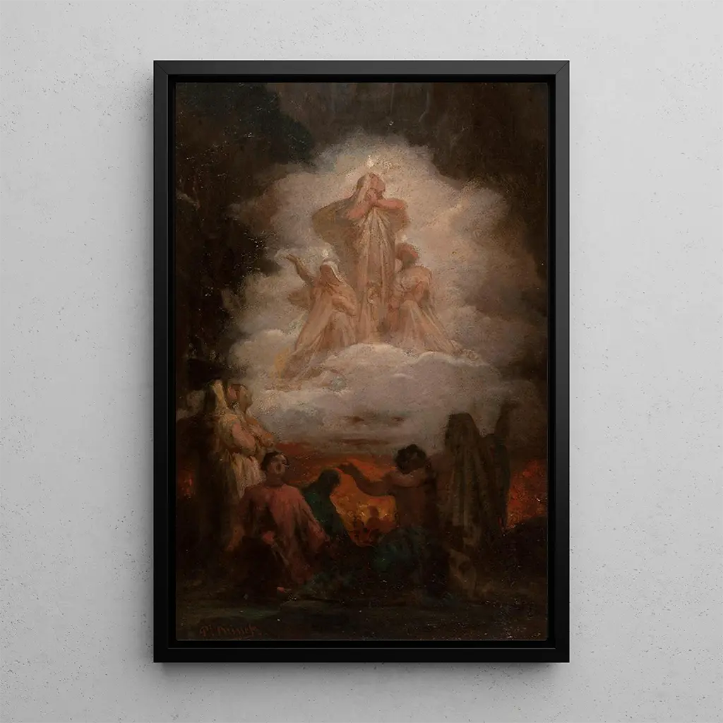 Tämä kiehtova Pierre-Nicolas Brissetin teos, nimeltä "Les âmes du Purgatoire", upottaa katsojan mystiseen universumiin, jossa sielut vaeltavat elämän ja tuonelan välillä. Kompositio on rikas yksityiskohdista, esittäen ihmishahmoja kärsivän ilmein, ympäröitynä tummilla sävyillä ja eteerisillä valoilla, jotka luovat sekä häiritsevän että pohdiskelevan tunnelman. Brissetin tekniikka, jossa yhdistyvät chiaroscuro ja kirkkaat värit, korostaa kohtauksen draamaa ja kutsuu syvälliseen pohdintaan ihmisluonnosta ja sielujen kohtalosta.