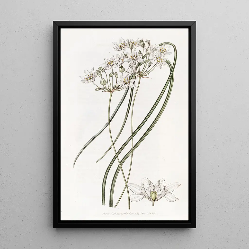 Hespéroscordum blanc laiteux -taidegrafiikka, jonka on luonut Sydenham Edwards, esittää hienostuneen akvarellin, jossa valo leikkii valkoisen ja vihreän sävyillä. Lehdet, lähes läpikuultavat, vaikuttavat vangitsevan aamu-usvan pehmeyden, kun taas pitkät varret viittaavat villien kasvien arvokkuuteen. Tämä kangas huokuu rauhaa ja kutsuu katsojan uppoutumaan rauhoittavaan kukkamaailmaan. Akvarellitekniikka mahdollistaa lehtien ja kukkien yksityiskohtien hienostuneen esittämisen, luoden visuaalisen harmonian, joka lumoaa ja kuljettaa katsojan mukanaan.