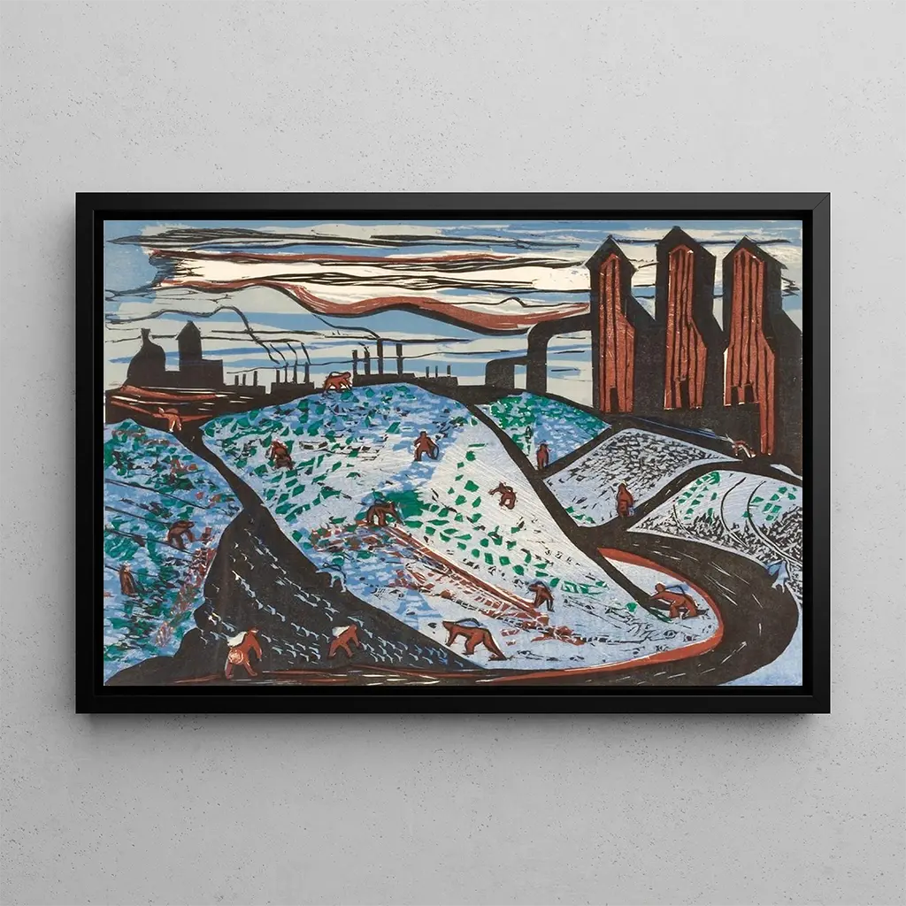 « Ramasseurs de charbon » est une œuvre poignante qui capture la dure réalité du travail des mineurs. Les figures humaines, représentées avec une intensité dramatique, sont plongées dans une atmosphère sombre, où les nuances de noir et de gris dominent. David Burke utilise des contrastes saisissants pour mettre en valeur la lutte et la résilience de ces travailleurs. La composition dynamique, avec des lignes qui dirigent le regard vers les personnages, renforce l'impact émotionnel de la scène, faisant de cette toile un véritable cri de ralliement pour la dignité humaine.