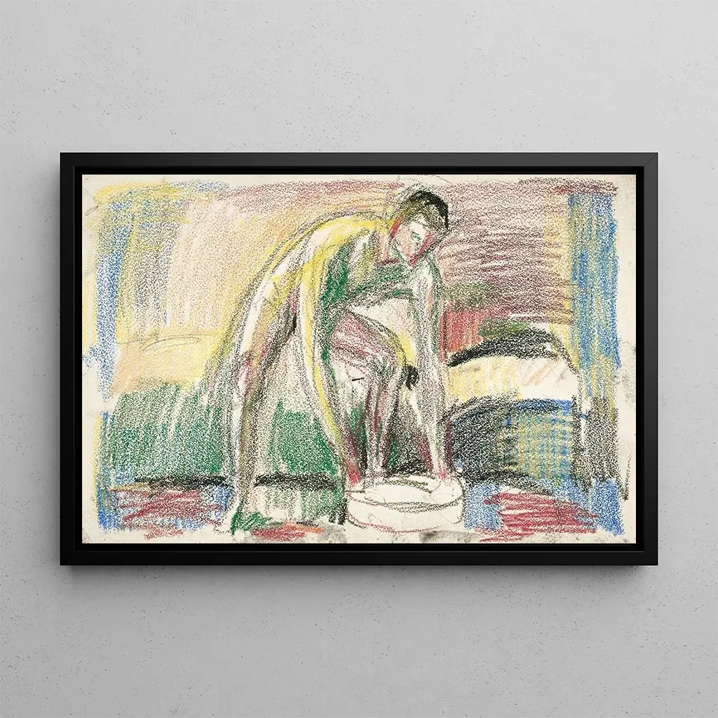 Edvard Munch, artiste norvégien emblématique de la fin du XIXe siècle et du début du XXe siècle, est souvent considéré comme le précurseur de l'expressionnisme. Son œuvre est profondément influencée par ses expériences personnelles et ses luttes intérieures, ce qui se reflète dans ses thèmes récurrents de la mort, de l'amour et de la mélancolie. "Homme nu lavant ses pieds" s'inscrit dans cette exploration de la psyché humaine, témoignant de l'importance de Munch dans l'évolution de l'art moderne et son impact sur les générations futures d'artistes.