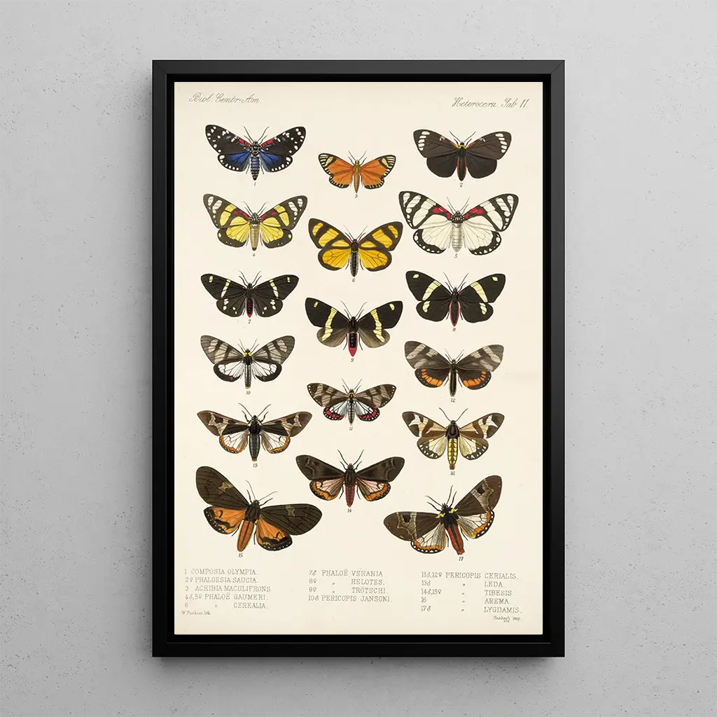 "Insecta Lepidoptera Heterocera Pl 011" Frederick DuCane Godmanilta on teos, joka korostaa yöllisten perhosten rikkautta. Tarkasti yksityiskohtiin paneutuen tämä taidegrafiikka paljastaa kuviot ja värit, jotka vangitsevat katseen. Tummat ja kirkkaat sävyt sekoittuvat harmonisesti, luoden salaperäisen ja lumoavan tunnelman. Godmanin tekniikka, joka yhdistää vesivärit ja piirustuksen, mahdollistaa näiden kiehtovien olentojen kunnioittamisen samalla tarjoten taiteellisen näkemyksen niiden luonnollisesta kauneudesta.