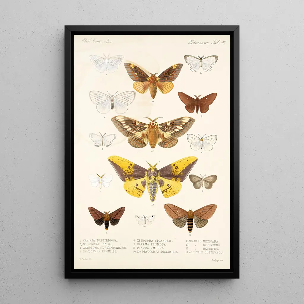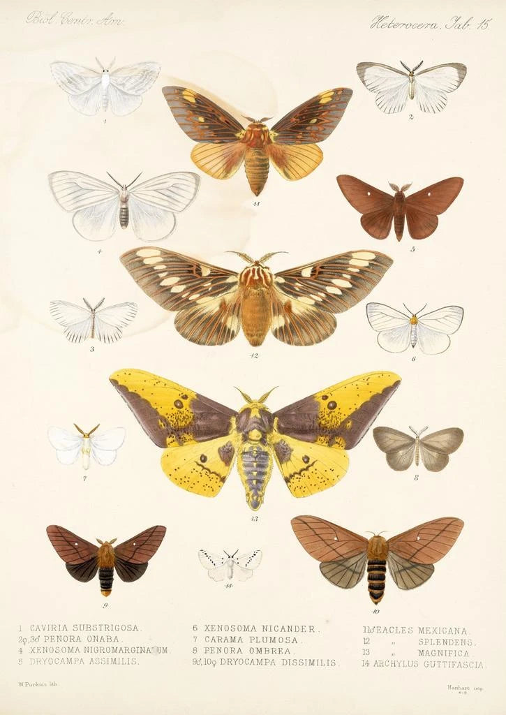 "Insecta Lepidoptera Heterocera Pl 015" Frederick DuCane Godmanilta on kiehtova taidegrafiikka, joka korostaa yöllisten perhosten monimuotoisuutta. Tämän taulun kautta Godman kuvaa tarkasti kirkkaita värejä ja hienostuneita kuvioita omaavia näytteitä. Vihreän, violetin ja oranssin sävyt sekoittuvat harmonisesti, luoden salaperäisen ja lumoavan tunnelman. Vesiväritekniikka, jota on käytetty huolellisesti, mahdollistaa siipien keveyden ja haurauden vangitsemisen, kutsuen katsojan ihailemaan näiden olentojen ohikiitävää kauneutta.