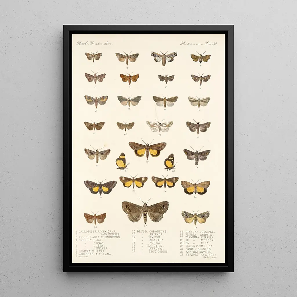 "Insecta Lepidoptera Heterocera Pl 030" de Frederick DuCane Godman on kiehtova taidegrafiikka, joka sukeltaa yöhymien värikkääseen maailmaan. Värikkäät sävyt ja hienovaraiset siipien kuviot vangitsevat katseen ja herättävät mielikuvituksen. Vesiväritekniikka, jota käytetään hienovaraisesti, mahdollistaa siipien keveyden ja läpinäkyvyyden kuvaamisen, luoden lähes taianomaisen tunnelman. Jokainen perhonen, sen yksityiskohtien kautta, kertoo tarinan kauneudesta ja mysteeristä, kutsuen katsojan ihailemaan siivekkään eläinlajin monimuotoisuutta.