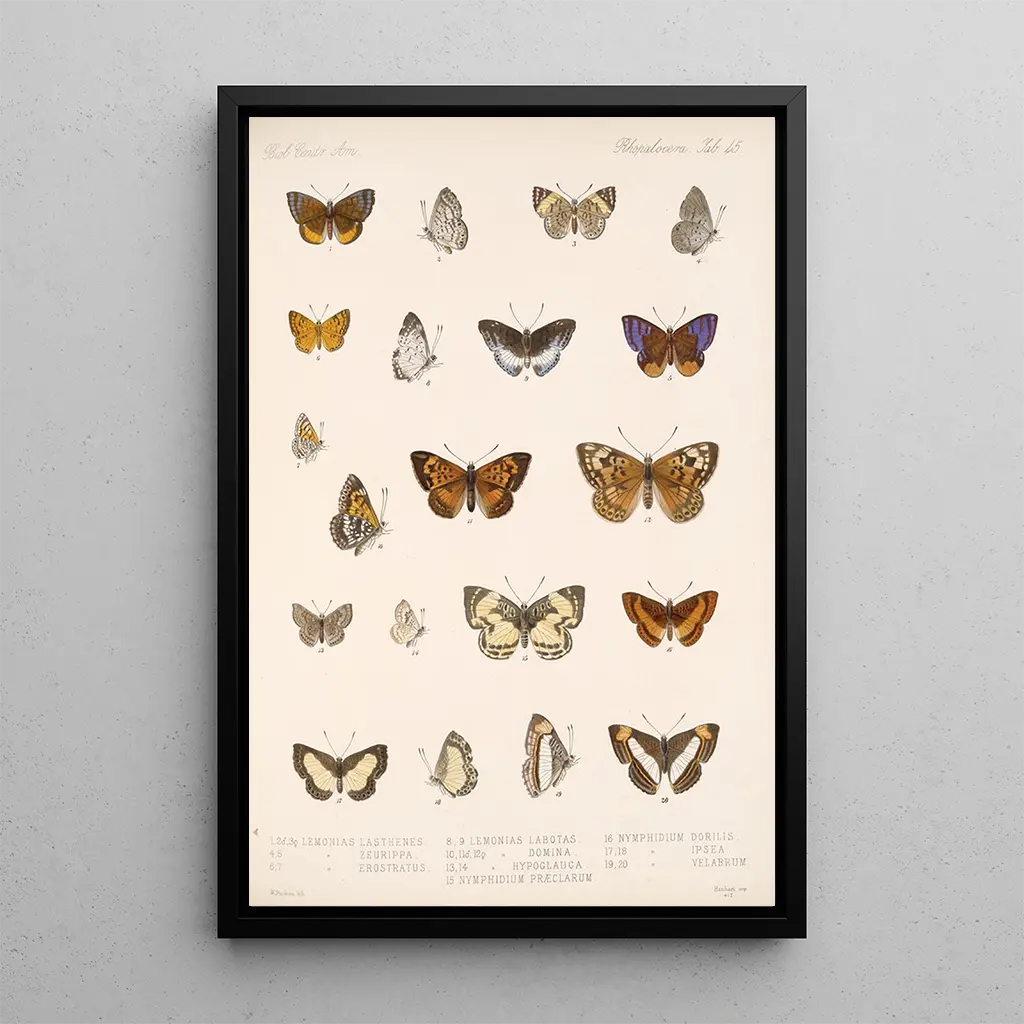 La reproduction Insecta Lepidoptera Rhopalocera Pl 046 paljastaa kirkkaiden värien paletin ja kiehtovat kuviot, jotka kuvaavat uskomatonta perhosten monimuotoisuutta. Jokainen yksityiskohta on huolellisesti toteutettu, hienovaraisista siivistä hienovaraisiin sävyihin, jotka viittaavat päivänvaloon. Tämä teos, luonnollisesta lähestymistavastaan johtuen, kutsuu tarkkaavaiseen pohdintaan, mahdollistaen näiden olentojen ohikiitävän kauneuden arvostamisen. Tämän kankaan välittämä tunnelma on sekä rauhallinen että inspiroiva, todellinen kunnioitus luonnolle.
