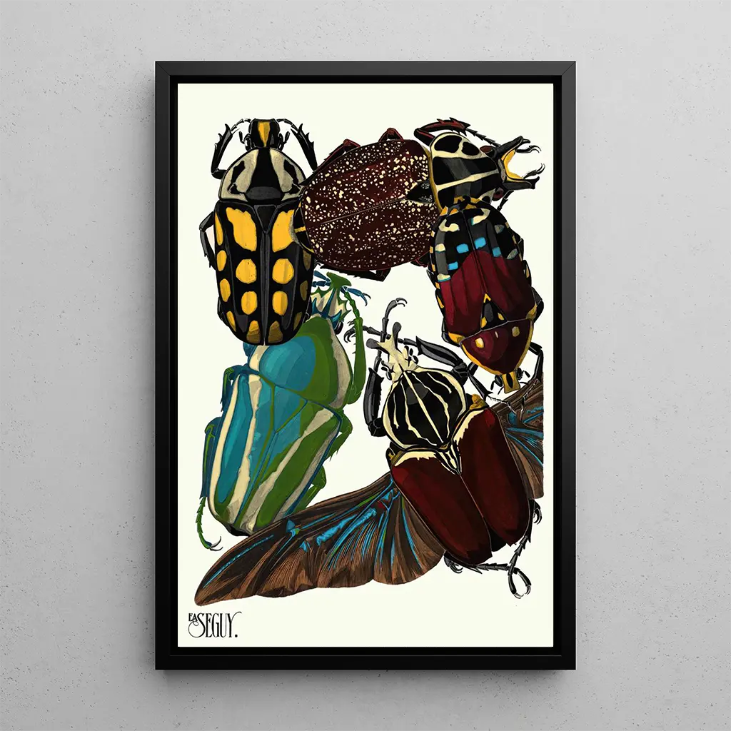Taidegrafiikka Insectes Pl03 kuljettaa meidät kiehtovaan maailmaan, jossa hyönteisten monimuotoisuus on esillä poikkeuksellisen tarkasti. Värikkäät sävyt ja yksityiskohtaiset elementit vangitsevat näiden usein vähän tunnettuja olentojen olemuksen. Séguy, tämän teoksen kautta, kutsuu meitä arvostamaan luonnon piilotettua kauneutta paljastamalla muotoja ja tekstuureja, jotka ensi silmäyksellä saattaisivat jäädä huomaamatta. Kankaan tunnelma on sekä dynaaminen että rauhoittava, luoden täydellisen tasapainon tutkimuksen ja pohdinnan välillä.