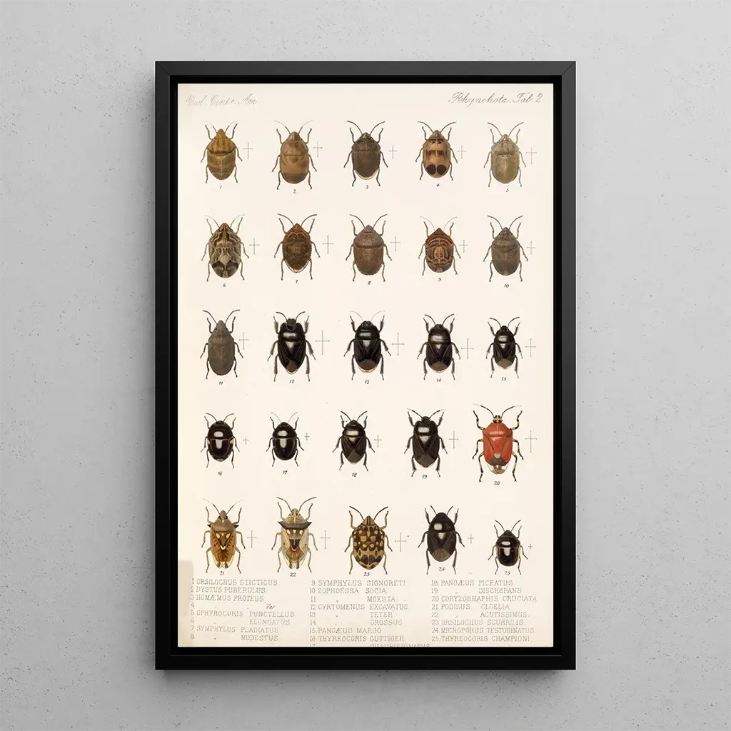 Taidegrafiikka "Insecta Rhynchota Hemiptera Heteroptera Pl 02" on erinomainen koristeellinen valinta erilaisiin tiloihin, olipa kyseessä olohuone, toimisto tai makuuhuone. Sen hienostunut estetiikka ja kiehtovat yksityiskohdat tekevät siitä taulun, joka herättää uteliaisuutta ja keskusteluja. Tulostuksen laatu takaa poikkeuksellisen uskollisuuden väreille ja yksityiskohdille alkuperäisteoksessa, tarjoten rikastuttavan visuaalisen kokemuksen. Sisällyttämällä tämän taulun sisustukseesi tuot lisää eleganssia ja kulttuuria, samalla juhlistaen luonnon ja tieteen kauneutta, mikä on todellinen etu kaikille taiteen ja biodiversiteetin ystäville.