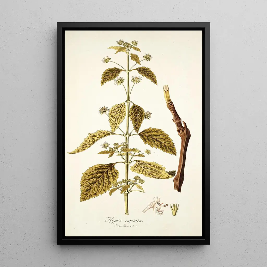 Hyptis capitata -taidegrafiikan, Nikolaus Joseph Freiherr von Jacquinin teoksen, sukellamme rikkaaseen ja eloisaan kasvitieteelliseen maailmaan. Vihreän, sinisen ja violetin sävyt sekoittuvat harmonisesti, luoden elävän ja rauhoittavan ilmapiirin. Vesiväritekniikka, jota käytetään hienovaraisesti, korostaa lehtien ja kukkien hienostuneisuutta samalla kun se vangitsee valon hienovaraisesti. Tämä taidegrafiikka ei ainoastaan kuvaa kasvin kauneutta, vaan myös ihmetystä luonnosta, kutsuen katsojan rauhalliseen pohdintaan.