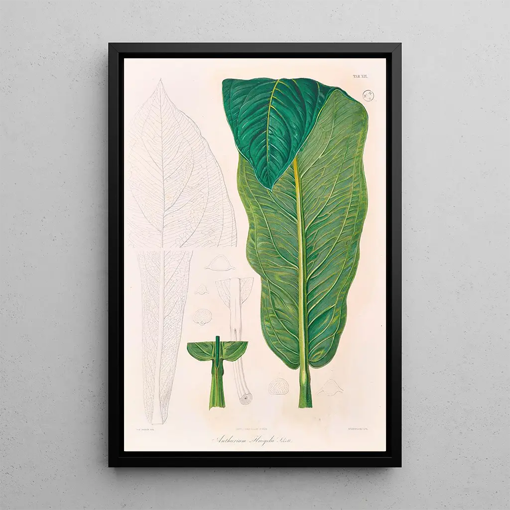 Tässä taidegrafiikka Icones Aroidearum Pl19 -teoksesta taiteilija Heinrich Wilhelm Schott johdattaa meidät kiehtovaan kasviuniversumiin. Lehtien ja kukkien eloisat sävyt sulautuvat harmonisesti, luoden sekä rauhoittavan että inspiroivan ilmapiirin. Yksityiskohtien tarkkuus, joka on tyypillistä aikakauden kasviillustraatioille, paljastaa Schottin huolellisuuden luonnon kauneuden havainnoinnissa ja uudelleenluomisessa. Jokainen teoksen elementti näyttää tanssivan valon alla, kutsuen katsojan tutkimaan tämän teoksen hienovaraisuuksia. Vesiväritekniikka, joka on käytetty mestarillisesti, korostaa muotojen ja värien herkkää hienostuneisuutta, tehden tästä taideteoksesta vangitsevan.