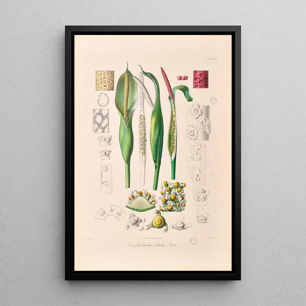 L’œuvre "Icones Aroidearum Pl23" de Heinrich Wilhelm Schott on todellinen kunnianosoitus trooppisen kasviston rikkaudelle. Tämä kasvitieteellinen kuva, joka on toteutettu huolellisella tarkkuudella, paljastaa kiehtovia yksityiskohtia aroidikasveista. Värien eloisuus, joka ulottuu rehevistä vihreistä räikeisiin violetteihin ja keltaisiin sävyihin, luo elävän ja dynaamisen ilmapiirin. Käytetty etsaustekniikka mahdollistaa lehtien tekstuurin ja kukkien hienostuneisuuden vangitsemisen, kutsuen katsojan sukeltamaan näiden kasvilajien kiehtovaan maailmaan. Jokainen elementti koostumuksessa vaikuttaa kertovan tarinan, kuljettaen meidät trooppisten sademetsien sydämeen.