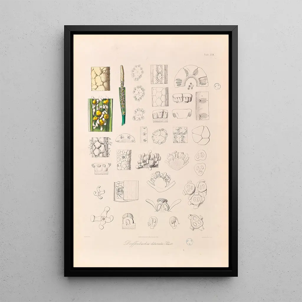 „Icones Aroidearum Pl30“ Heinrich Wilhelm Schottin teos, joka kuljettaa katsojan vehreään maailmaan täynnä muotoja ja värejä. Tämä kasviillustraatio korostaa arumien ominaisia piirteitä, yksityiskohtien ollessa tarkkoja ja paljastavat kunkin kasvin monimutkaisuuden. Rikkaat ja monipuoliset sävyt, syvän vihreästä kirkkaisiin valkoisen ja violetin sävyihin, luovat elävän ja dynaamisen tunnelman. Kaiverrustekniikka, yhdistettynä tarkkaan havainnointiin, mahdollistaa Schottin vangitsevan näkemään näiden kiehtovien kasvien olemuksen, tarjoten samalla kutsun tutkia luonnon kauneutta.