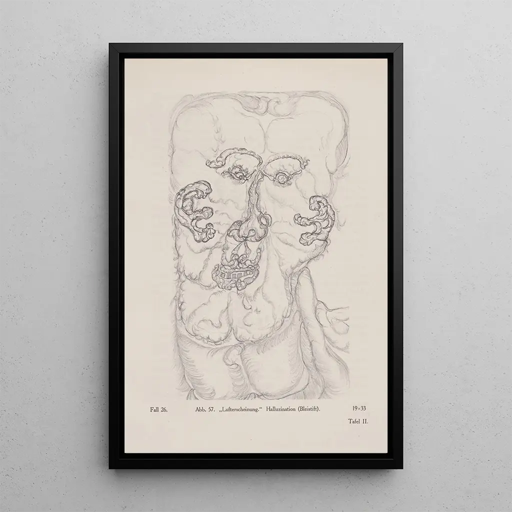 L'œuvre "Apparition aérienne Hallucination Crayon" de Hans Prinzhorn invite à une exploration fascinante de l'esprit humain. Les couleurs vives et les formes abstraites se mêlent pour créer une atmosphère à la fois troublante et captivante. La technique employée, qui semble mêler le dessin à la peinture, donne vie à des visions étranges et poétiques. Chaque coup de crayon semble être une fenêtre ouverte sur un monde intérieur, où l'imaginaire et la réalité se confondent. Cette toile, véritable reflet des pensées et des émotions, transporte le spectateur dans un univers où l'art devient un moyen d'expression de l'invisible.