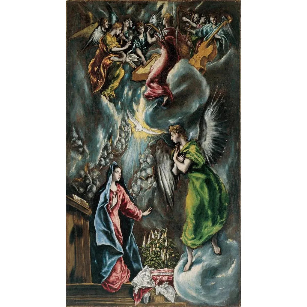 L'Annonciation d'El Greco est une œuvre qui transcende le temps et l'espace, capturant un moment de révélation divine. La composition dynamique, avec la Vierge Marie au centre, est entourée d'anges et de symboles sacrés, créant une scène à la fois dramatique et sereine. Les couleurs éclatantes et les contrastes saisissants accentuent l'intensité de l'instant, tandis que les figures allongées et les drapés fluides témoignent du style unique de l'artiste. Cette toile invite à la méditation, évoquant la rencontre entre le divin et l'humain.