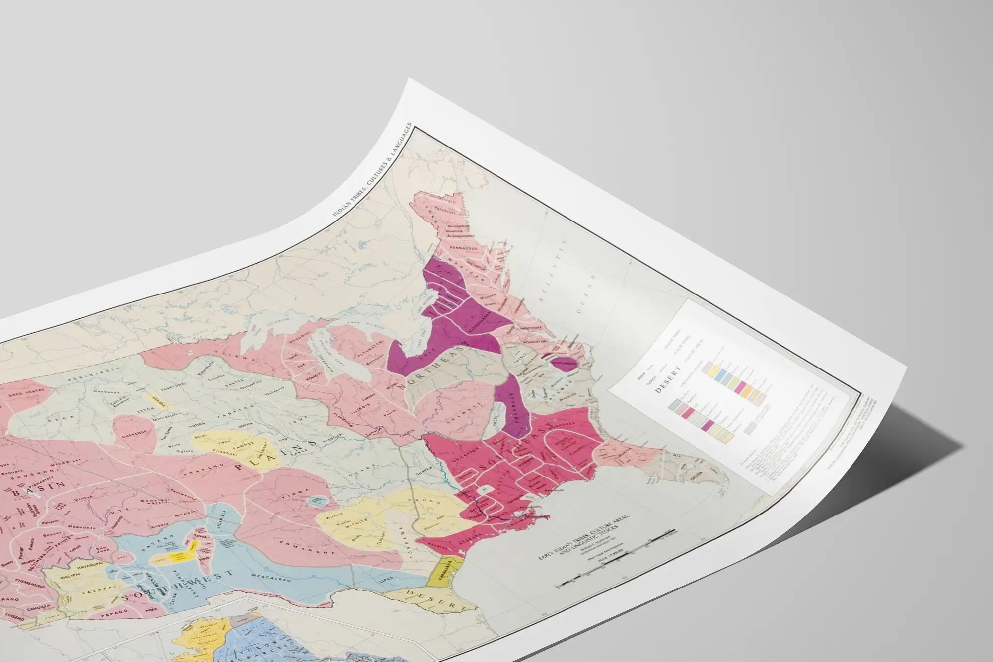 Tämä seinäkoristejuliste esittää yksityiskohtaisen kartan ensimmäisistä intiaaniheimoista, niiden kulttuurialueista ja kielivarannoista Yhdysvalloissa ja Alaskassa. Vuodelta 1967 ja Smithsonian-instituution tuottama kartta korostaa alkuperäiskansojen etnistä ja kielellistä monimuotoisuutta ennen teollistumista ja kaupunkien laajentumista. Se on erinomainen juliste rikastuttamaan oleskelutilaa tai toimistoa vintage-henkisellä ja opettavaisella vivahteella, yhdistäen estetiikan ja historian.