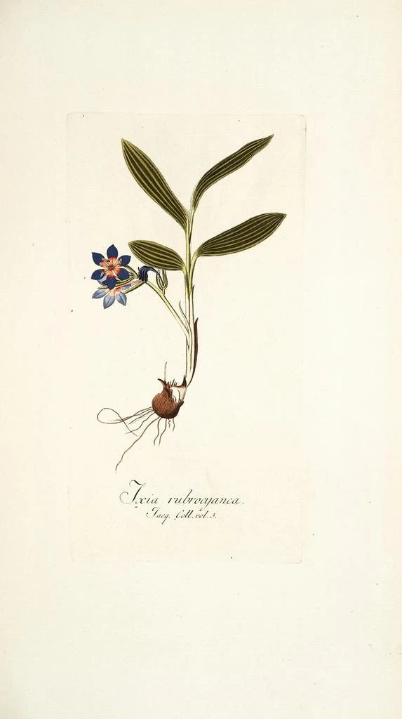 Nikolaus Joseph Freiherr von Jacquin, 1700-luvun kasvitieteilijä ja taiteilija, osasi yhdistää tieteen ja taiteen teoksissaan. Syntyjään Itävallasta, hänet vaikutti aikansa tutkimusmatkojen, erityisesti trooppisten alueiden, matkailut. Hänen teoksensa, usein tiedemiesten toimeksiannosta tehdyt, todistavat ajasta, jolloin kasvien tutkimus oli kukoistuksessaan. Jacquin oli keskeisessä roolissa eksoottisen kasviston dokumentoinnissa, ja hänen taulunsa, kuten "Ixia rubrocyanea", ovat tulleet viitteiksi kasvitieteilijöille ja taiteen ystäville. Hänen perintönsä elää edelleen, yhdistäen tieteellistä tarkkuutta ja esteettistä herkkyyttä.