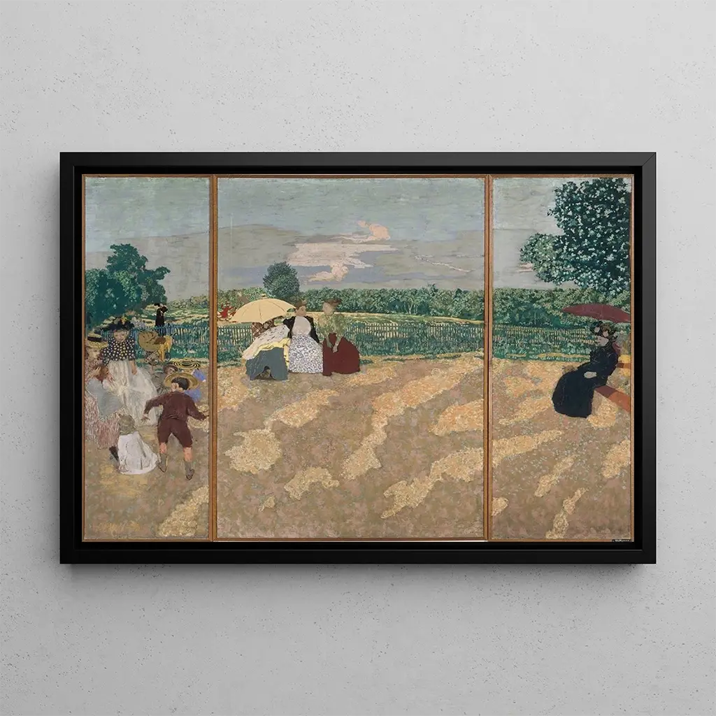 Édouard Vuillard, actif à la fin du XIXe et au début du XXe siècle, est l'un des principaux représentants du mouvement nabi, qui prônait une approche plus personnelle et symbolique de l'art. Influencé par les impressionnistes et les arts décoratifs, Vuillard a su développer un style unique, caractérisé par des compositions intimes et des couleurs éclatantes. Ses œuvres, souvent centrées sur la vie domestique et les scènes de la vie quotidienne, révèlent une sensibilité particulière à l'environnement et aux interactions humaines. Jardins publics est un exemple parfait de son talent pour capturer l'essence des moments fugaces.