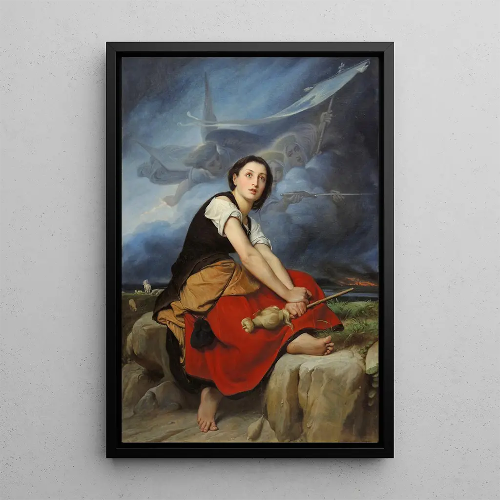 Tässä ikonisessa teoksessa François-Léon Benouville tallentaa Jeanne d'Arc'n elämän keskeisen hetken, jossa nuori sankaritar, näkevin näkyin, vaikuttaa olevan kiinnittyneenä maallisen ja jumalallisen maailman välillä. Rikkaat värit ja yksityiskohtaiset pinnat luovat mystisen tunnelman, korostettuna pehmeällä valolla, joka valaisee Jeanne d'Arc'n kasvoja. Kompositio, keskittyen hänen tarkkaavaiseen kuunteluasentoonsa, kutsuu katsojan kokemaan hänen henkisen sitoutumisensa syvyyttä. Taiteilija onnistuu välittämään aistikkaan tunteen, tehden tästä taidegrafiikka-reproduktiosta ei vain taulun, vaan todellisen mietiskelykokemuksen.